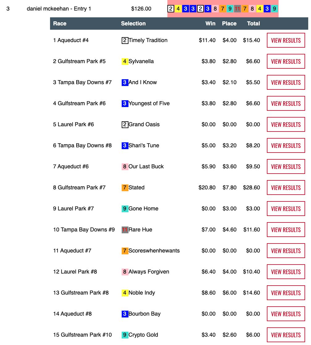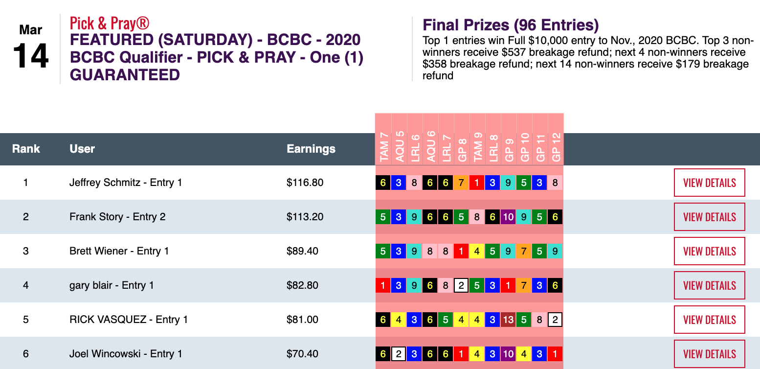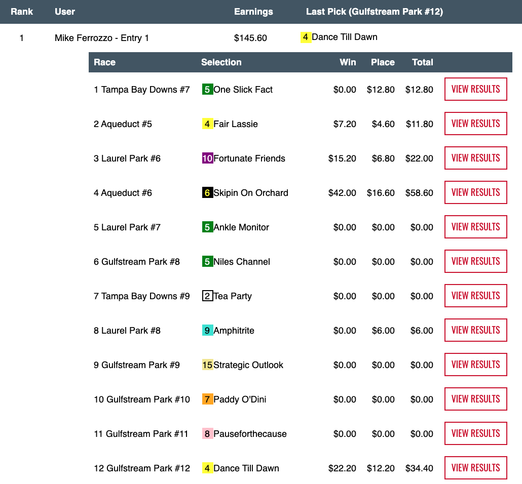 Ferrozzo had 3 wins and a place over those races (Wagner had a “mere” two wins and two places) to rack up $105.20 en route to a day-best final total of $145.60, which got him an NHC seat along with runner up Brett Wiener (4 wins, 2 places). Both Ferrozzo and Wiener had Dance Till Dawn ($22.20, $12.20) who got elevated to first via DQ in the final tourney race, the 12th at Gulfstream. Ferrozzo would have gotten his NHC seat anyway—even without the stewards’ involvement—but the takedown was particularly painful for Doug Bredar, who would have gotten the other seat had the the original winner, Yako, not gotten goofy in the stretch.