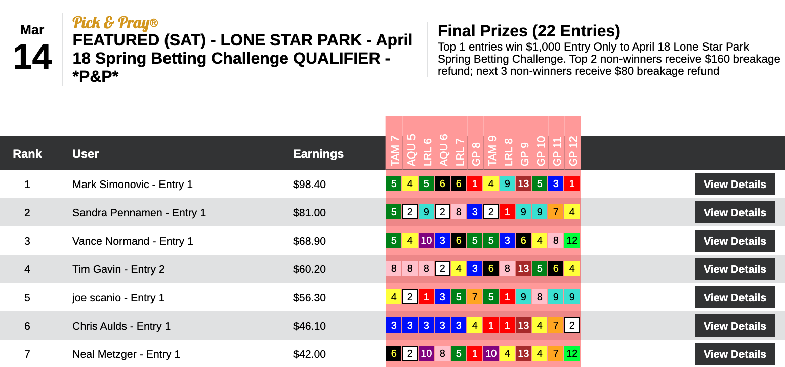 Simonvic added one first and four seconds to his Aqueduct tote rocker, and that earned him a $1,000 entry to the Lone Star Park Spring Betting Challenge.