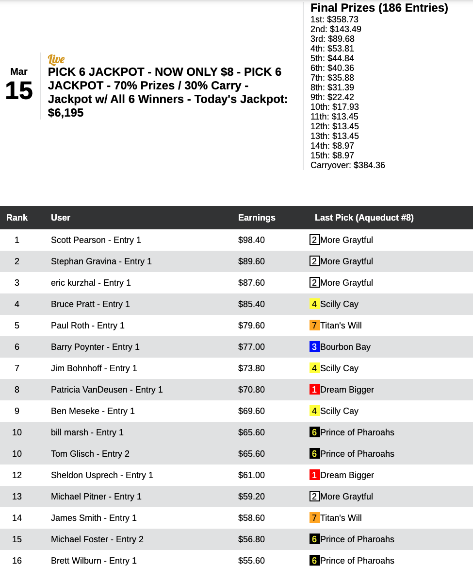 Pearson didn’t earn the 6-for-6 Jackpot, but he swept the middle four races to take top honors. Inspired perhaps by the $6,195 Jackpot entering Sunday, 186 players showed up to take an $8 swing at the big prize. On paper, things looked ripe for action. Fields were short, and none of the six heats wound up with more than seven horses. (We try not to go too heavy on big fields in this event.) So wouldn’t you know that only one player (16th place finisher Brett Wilburn) managed to win even the first two races? Oh well. Next Sunday’s Jackpot will be up to $6,579.