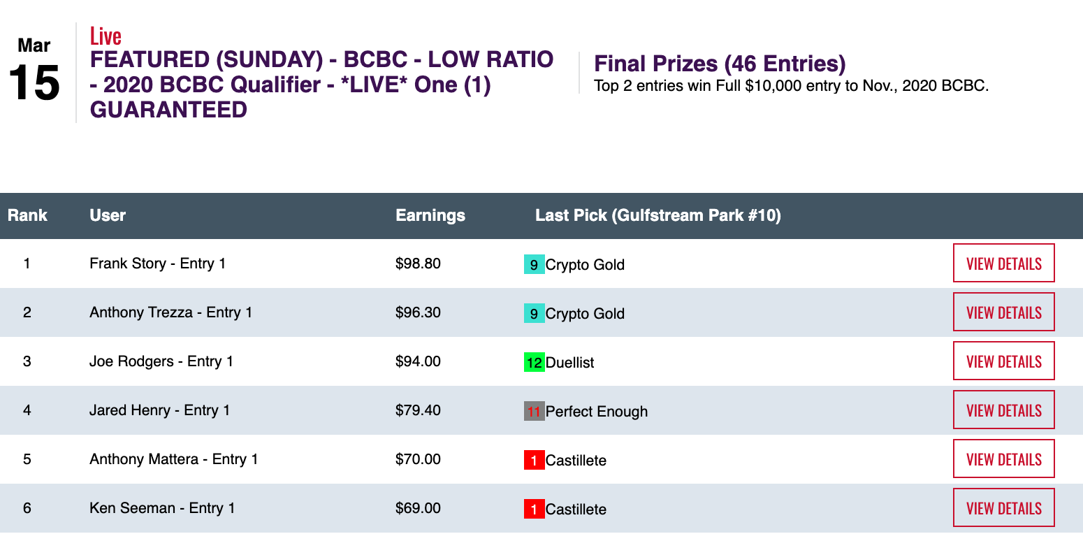 Victory seemed an unlikely story for Frank after he got blanked in the first five races. But four winners and a runner up thereafter made for a happy ending. In fact, it was a doubly happy ending for Story given that he had a close-but-no-cigar second in Saturday’s BCBC qualifier. Trezza, meanwhile, had 3 wins and 2 places to finish second. His horse racing skills have apparently been made even more keen by the shortage of other sports on which to wager.