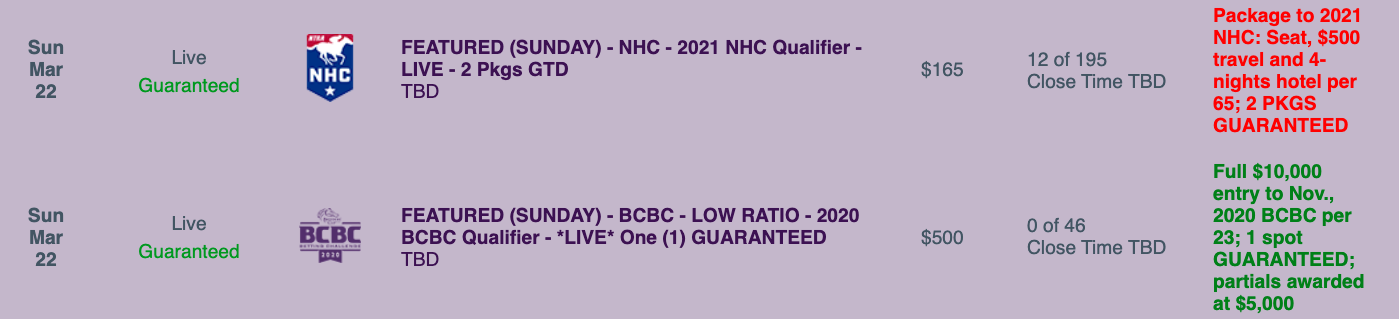A newcomer to the Sunday lineup is a qualifier to the April 4 Santa Anita Derby Challenge. Again, this Santa Anita Challenge will be played at Xpressbet…even if it can’t be held onsite at Santa Anita. It’s $177 to enter, and winners (one per each 20 entries) get a $3,000 entry for April 4th.