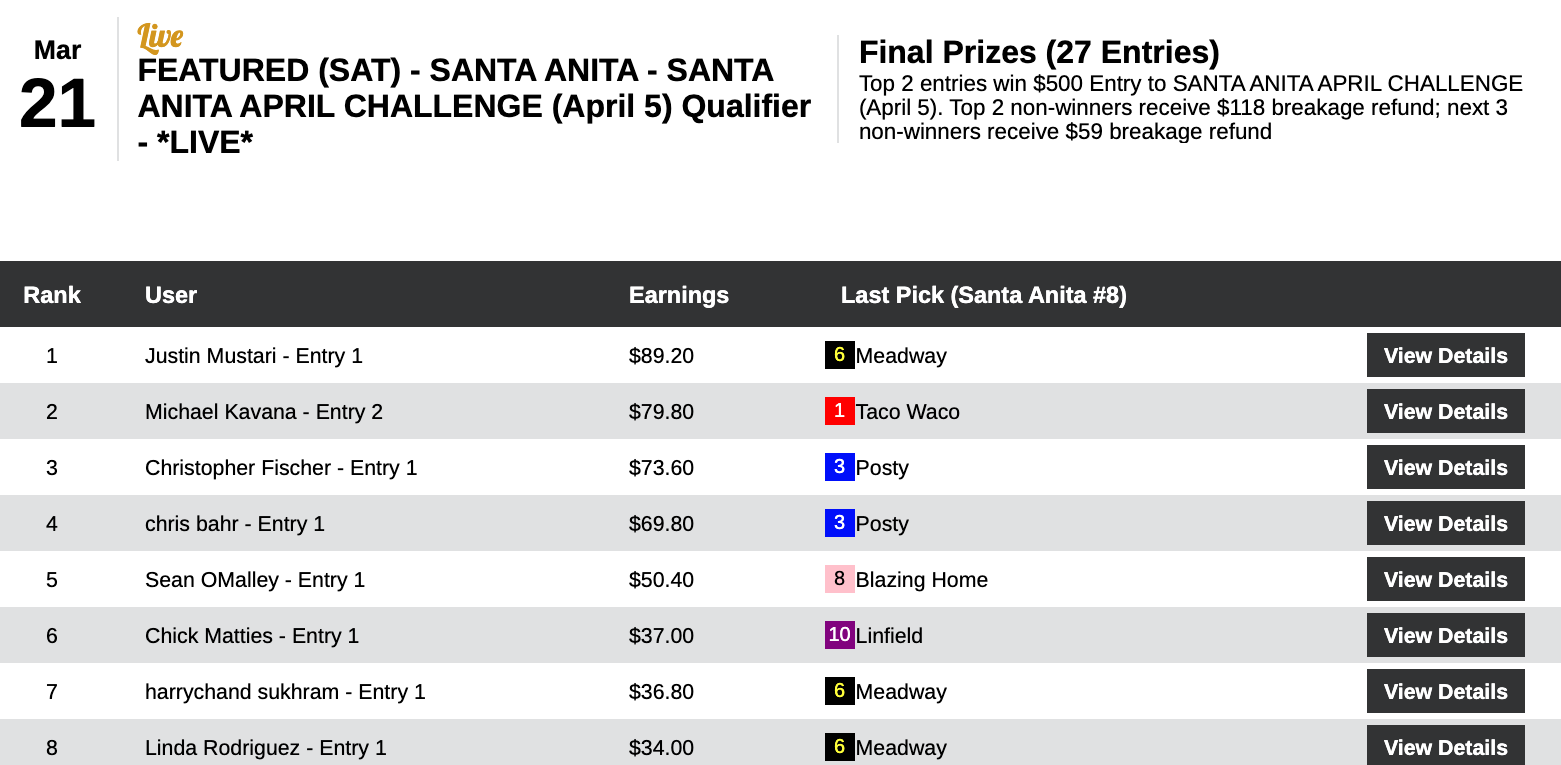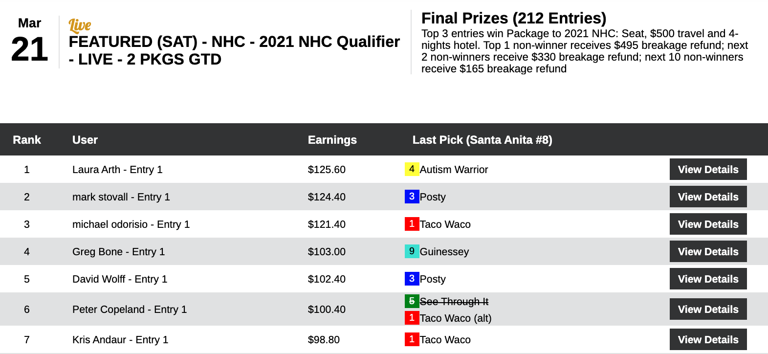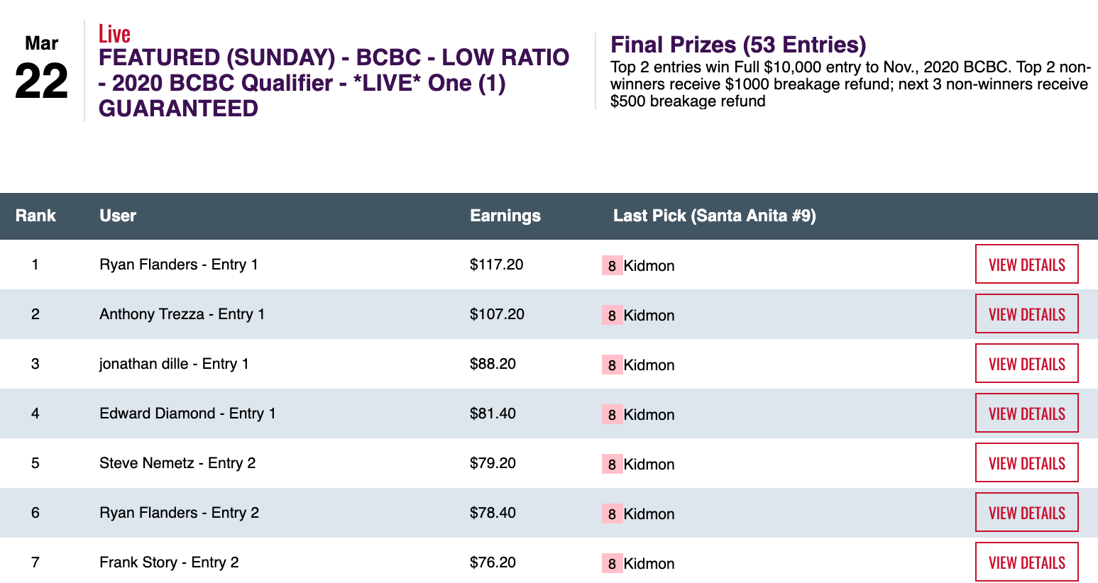 The two players who will be heading to heading to Santa Anita (or perhaps, more likely, cyberspace) on April 5th are Justin Mustari who had 2 wins and a place and Michael “Copa” Kavana (4 wins, 1 place). Both receive $500 entries for the Challenge. Your last chance to qualify for this one comes next weekend.