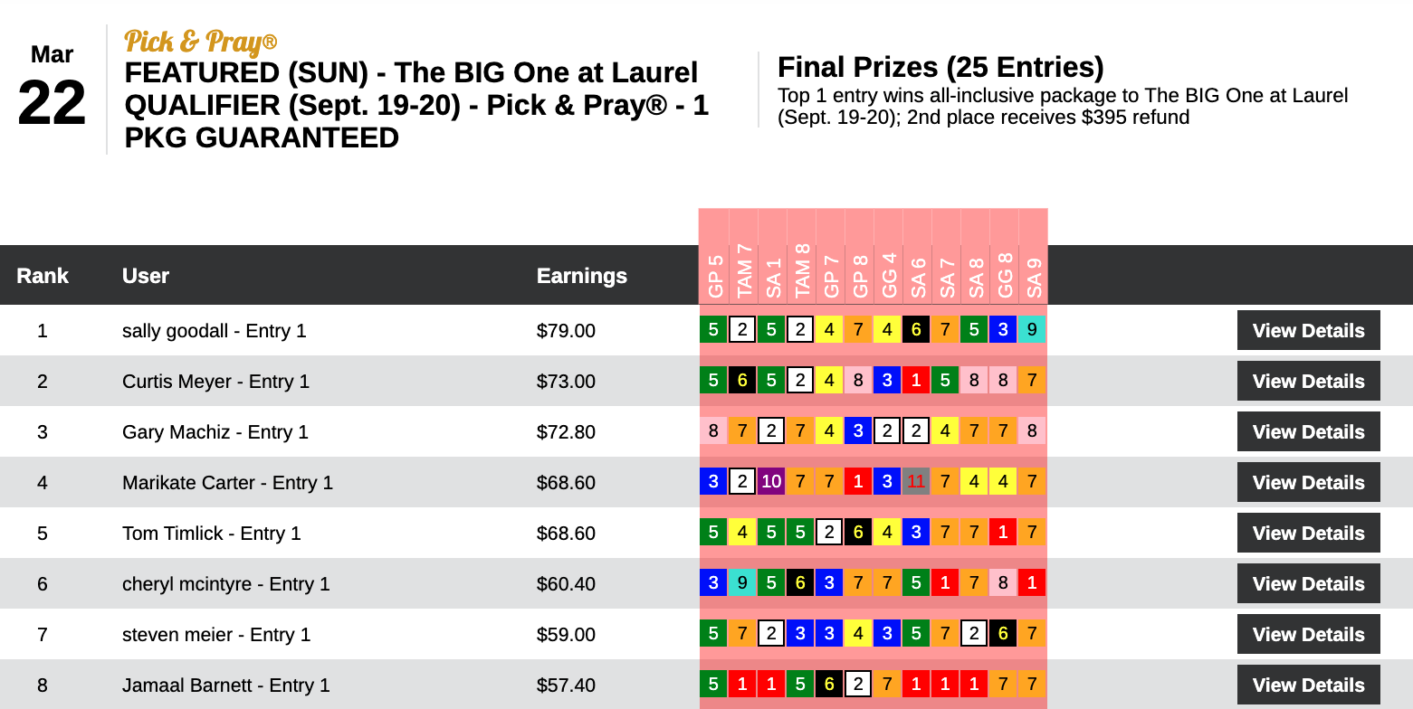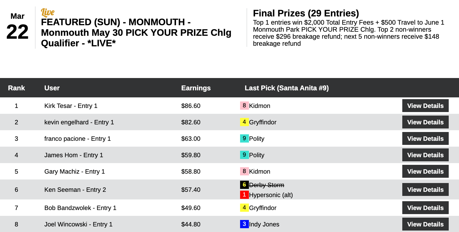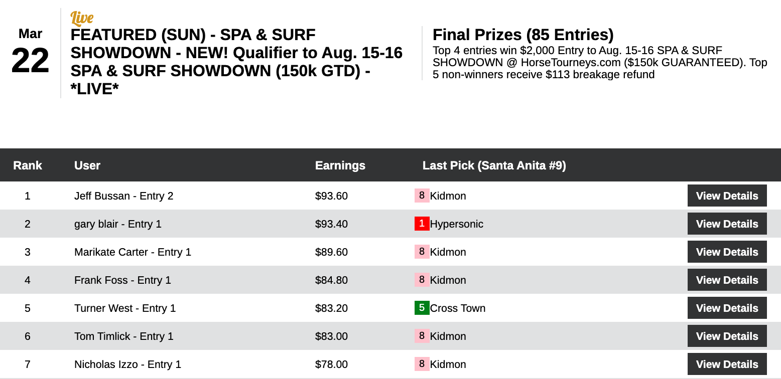 The two players who will be heading to heading to Santa Anita (or perhaps, more likely, cyberspace) on April 5th are Justin Mustari who had 2 wins and a place and Michael “Copa” Kavana (4 wins, 1 place). Both receive $500 entries for the Challenge. Your last chance to qualify for this one comes next weekend.
