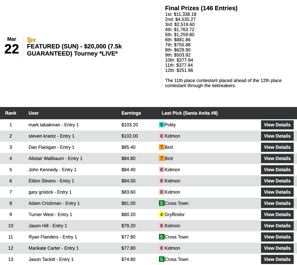 While we weren’t prescient enough to leave Santa Anita and Golden Gate in our Friday featured tourneys, we WERE still able to at least offer them (along with Tampa) in single-track tourneys. So at least there was that!