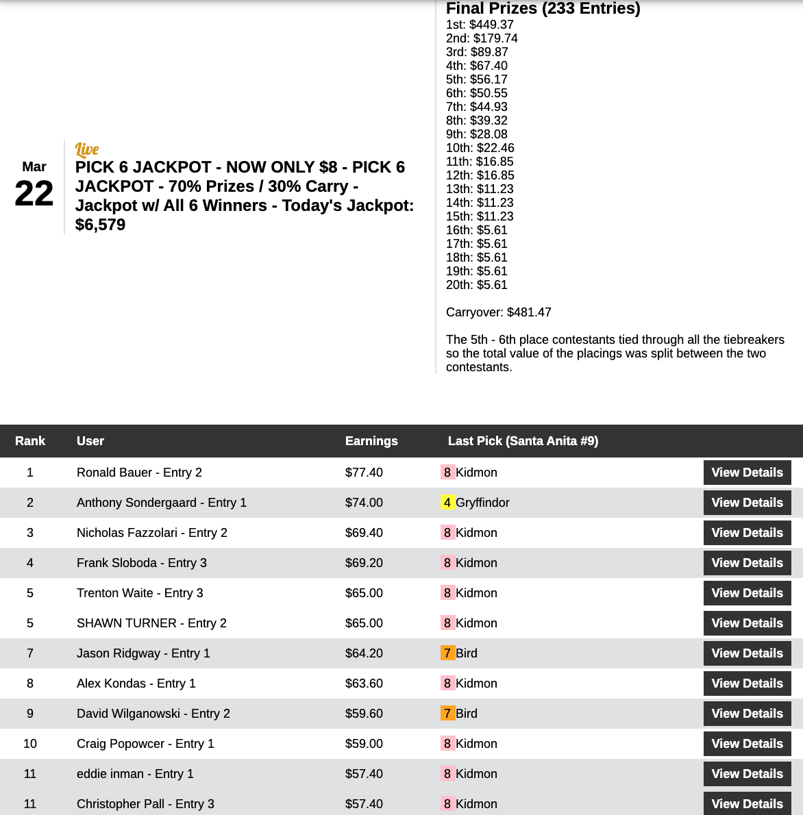 Petoskey had the winners of the final three races (including 8-1 shot Kidmon in the Santa Anita finale) to finish with 4 wins and 3 places and edge Paul Cush by just 40 cents. Petoskey earned $15,673; Cush, $4,478. The 22-player game finished with a total pot of $22,390.
