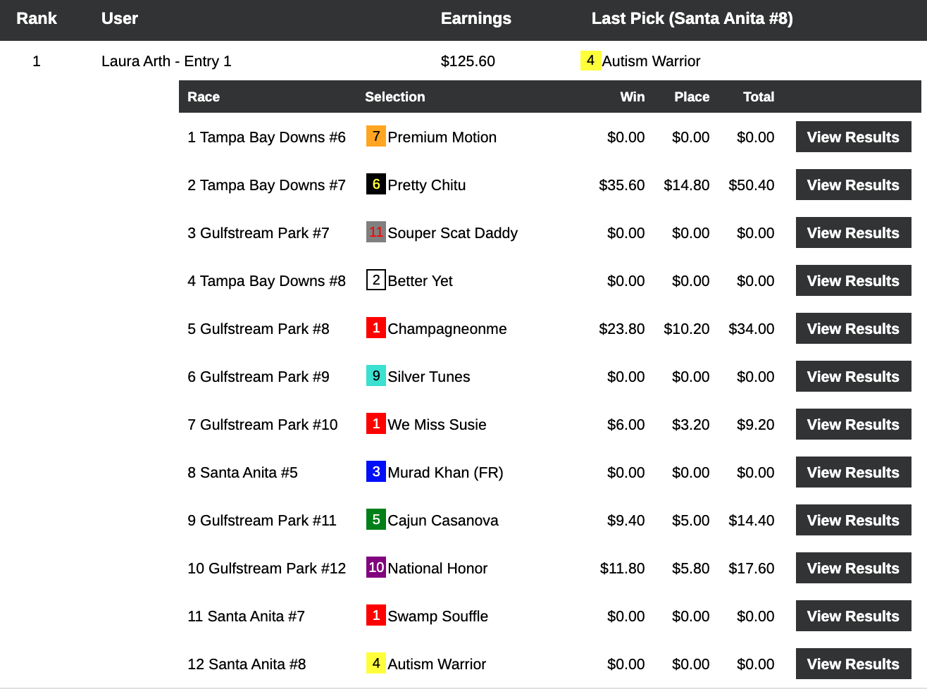 It closed with a large pot of $25,195—$11,338 of which was won by Mark “Santana” Tabakman, who had 6 winners, followed by his lone place collection of the day…with Polity ($7.20) in the final race. That place cash enabled Tabakman to hold off runner up Steven Krantz who had Kidmon ($18.40, $8.40) in that last race.