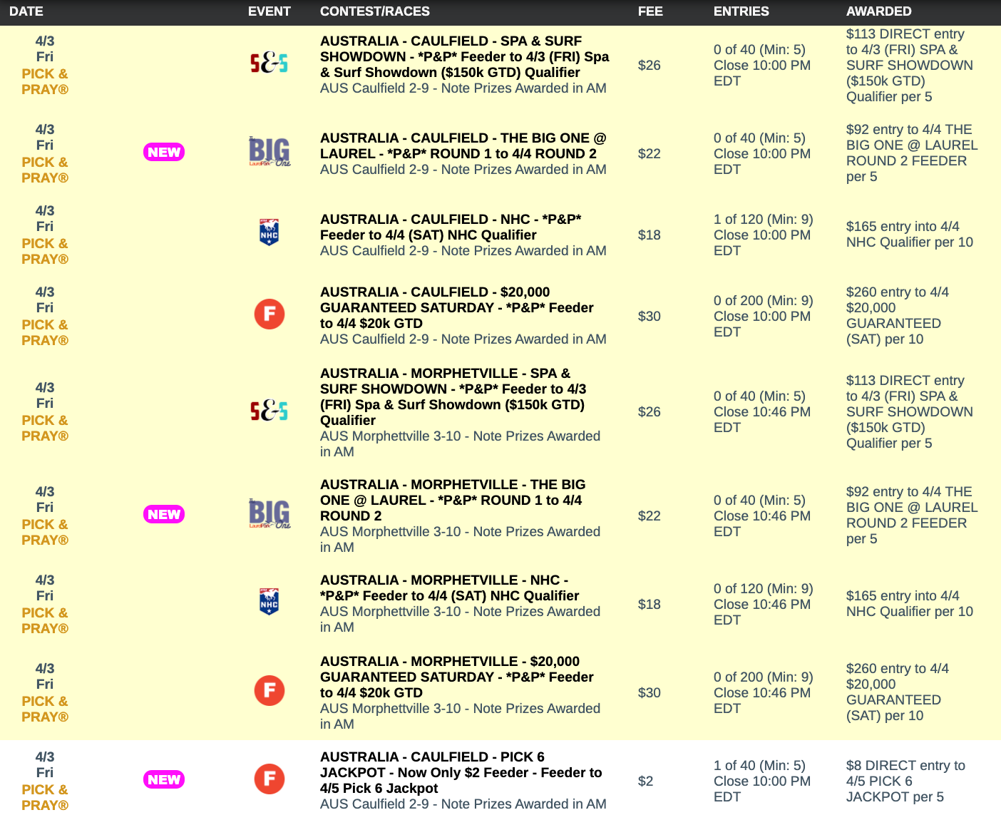 The other two All Optional Live tourneys are our qualifiers to the Spa & Surf Showdown and the Monmouth Pick Your Prize tournament.