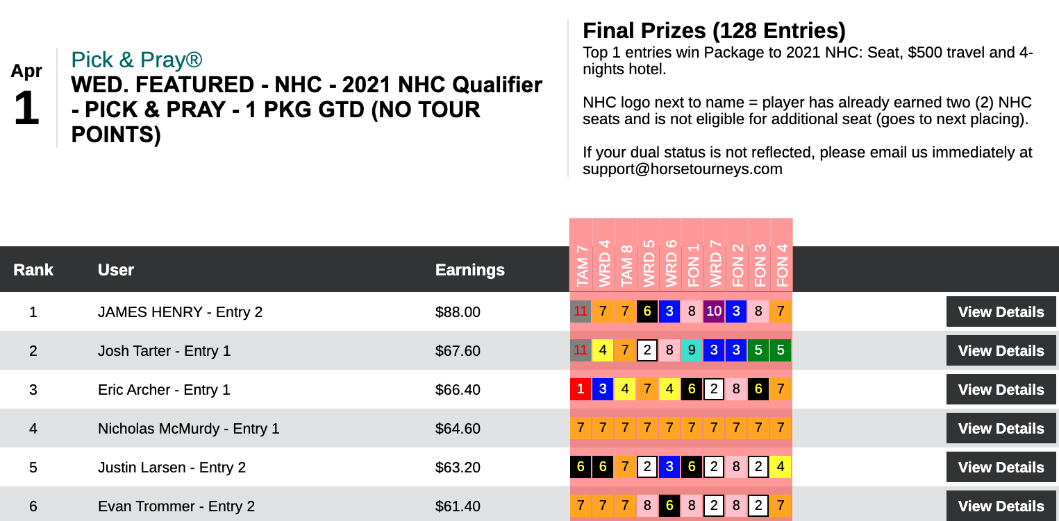 That’s no less than 2013 Horse Player World Series champ James Henry (4 wins, 2 places) on top of the leaderboard of Wednesday’s $75 NHC qualifier. He may have won this event simply because of his…discriminating…use of 7s. While fourth-place finisher Nicholas McMurdy used them all, Henry just selected three—and all three won, including Legendary Song ($16.60, $5.60) in the final tourney race, the 4th at Fonner.