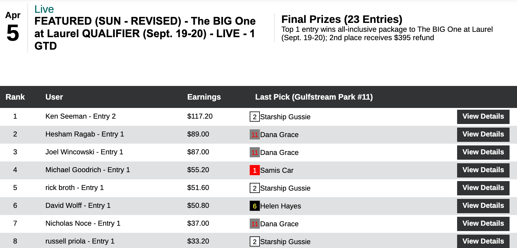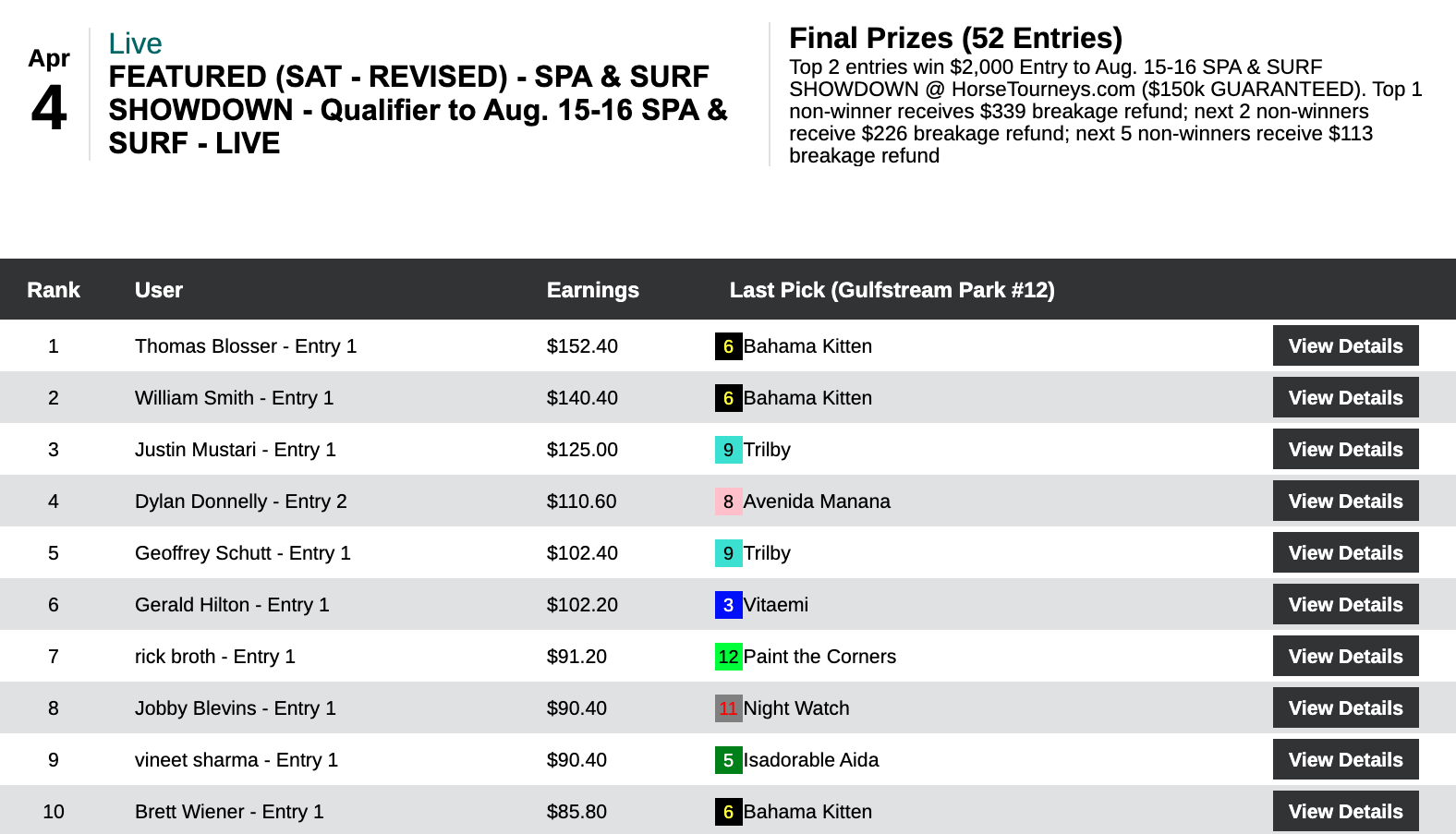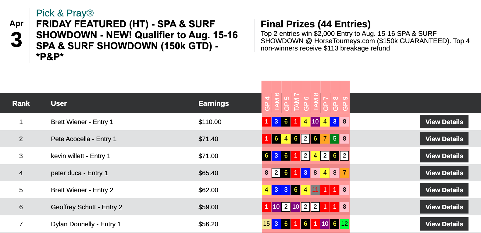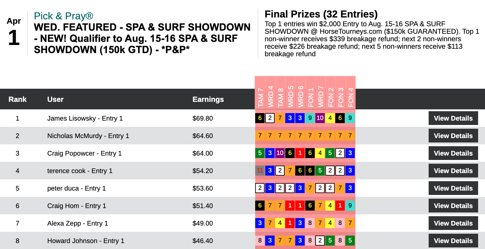 All in all, it was a $10,000+ day for Seeman, who pulled off the rare feat of sweeping all of the day’s qualifying events here at HorseTourneys. Also picking up a $2,000 Spa & Surf entry in this one was runner up Jon “Hurricane” Hurd. (3 wins, no places). Since the Showdown is an online event, you can be sure that Hurd will be further stepping up his always-strong (and fun) Twitter game come August 15-16.