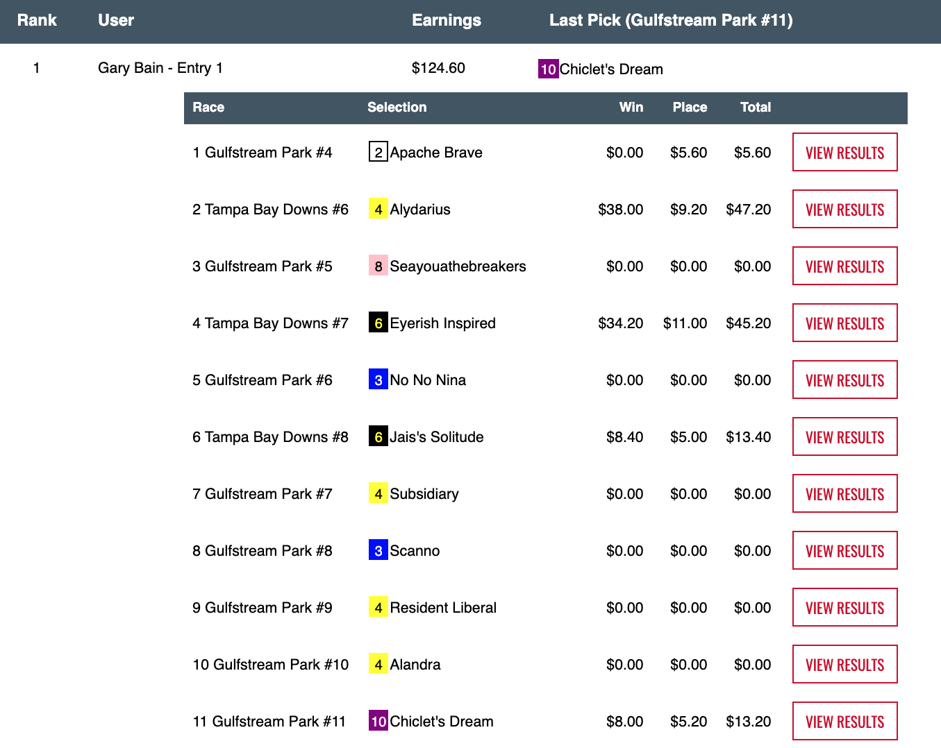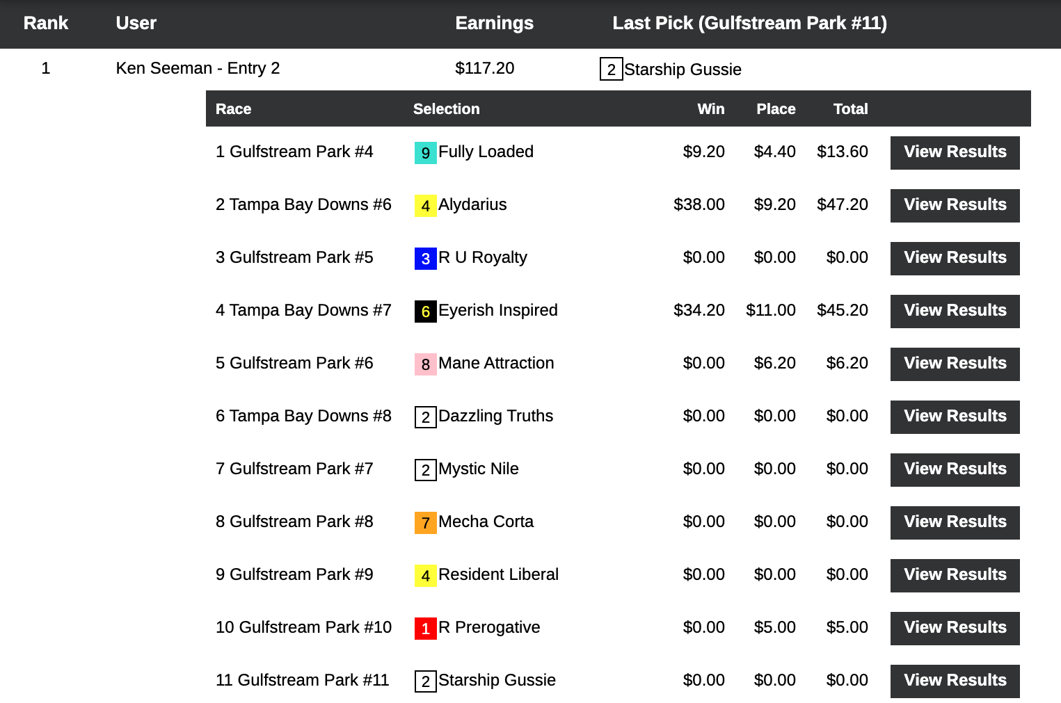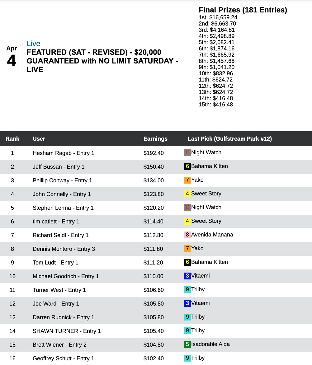 Glenn Bechtel led the way in this high-end, $1,150 buy-in game. He picked 3 winners — topped by Alydarius ($38.00, $9.20) in the 6th at Tampa. Not to be overlooked is Bechtel’s one place collection…since he wound up finishing first by just $1.60. That $1.60 meant a first-place prize of $14,960 for Bechtel…from a total kitty of $21,372.