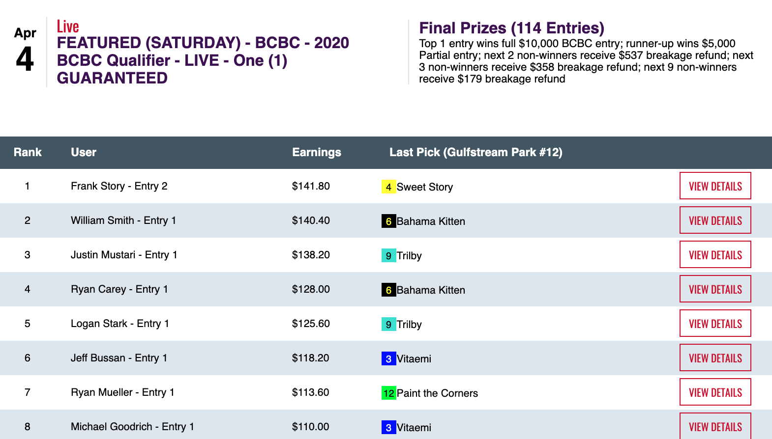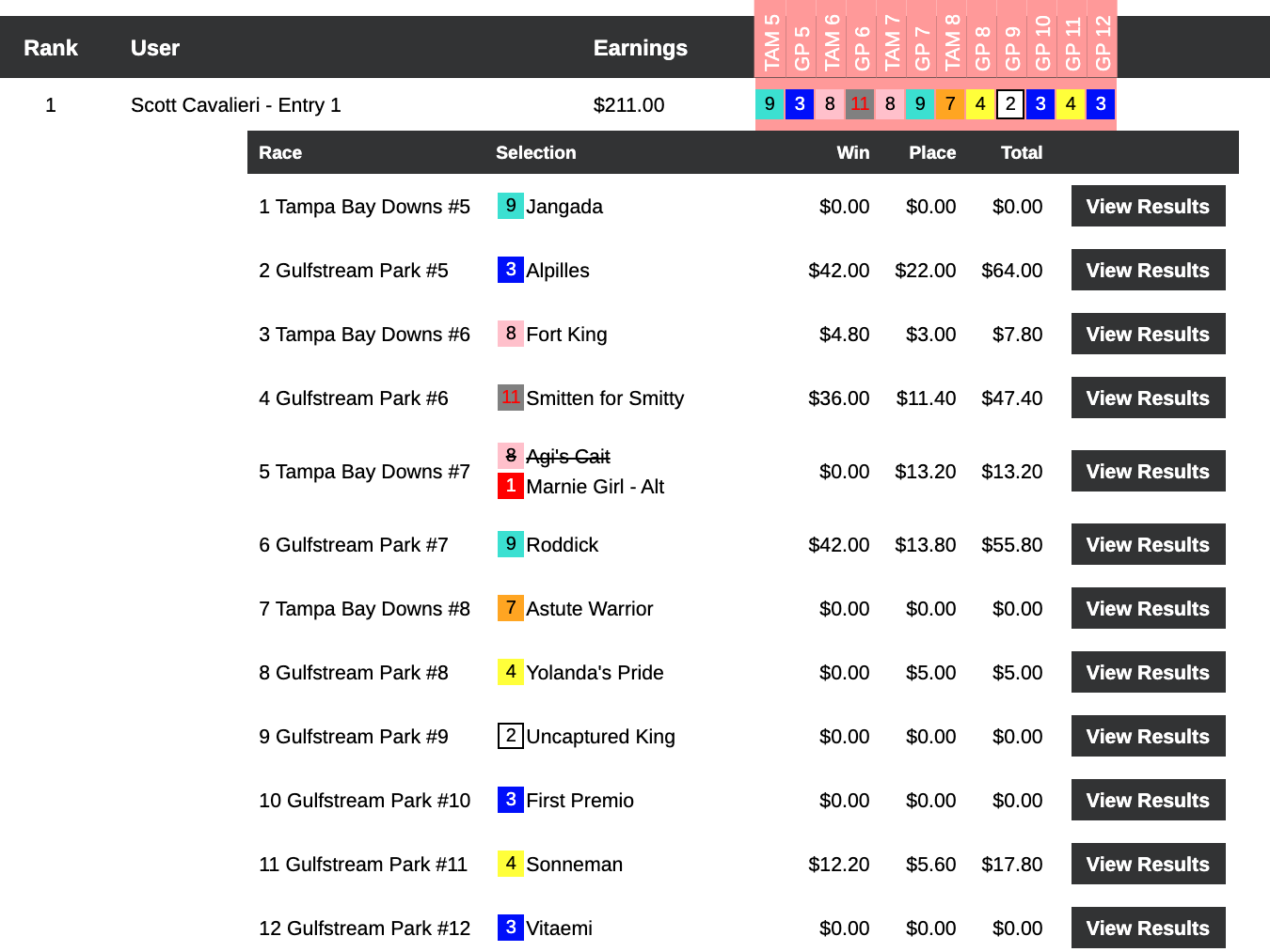 Here, Smith had to settle for a $5,000 partial BCBC entry—because Frank Story topped him with 4 wins and 2 places, including a 17-1 Gulfstream Race 6 winner with the somewhat ironic name of Smitten for Smitty. (For those who are wondering…yes…Smith also had Smitten for Smitty.)