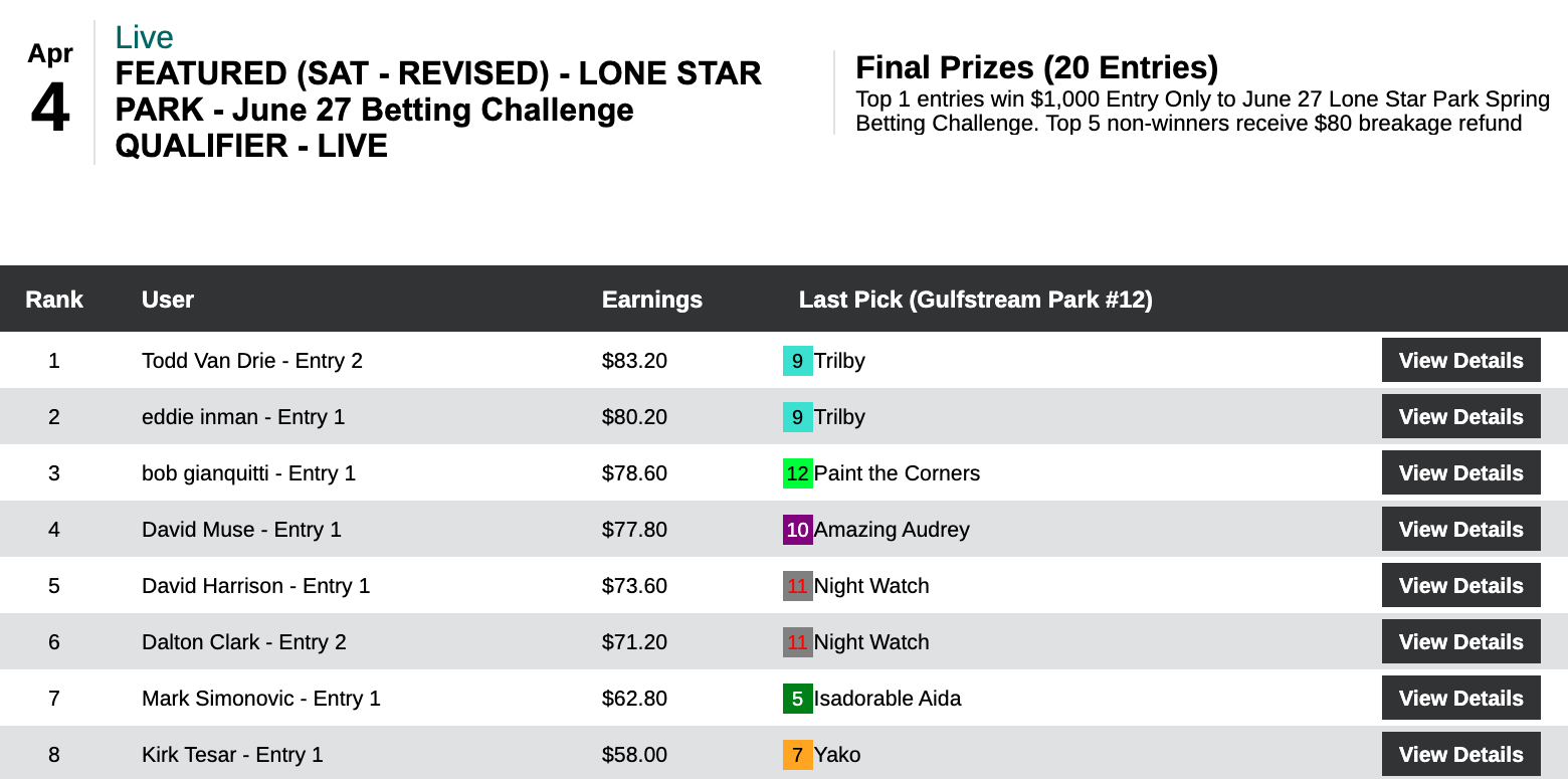 The one player to win a featured event on Saturday without cracking triple digits was Todd Van Drie, who turned the trick despite blanking on the first five races in the day’s qualifier to the June 27 Lone Star Park Spring Betting Challenge.