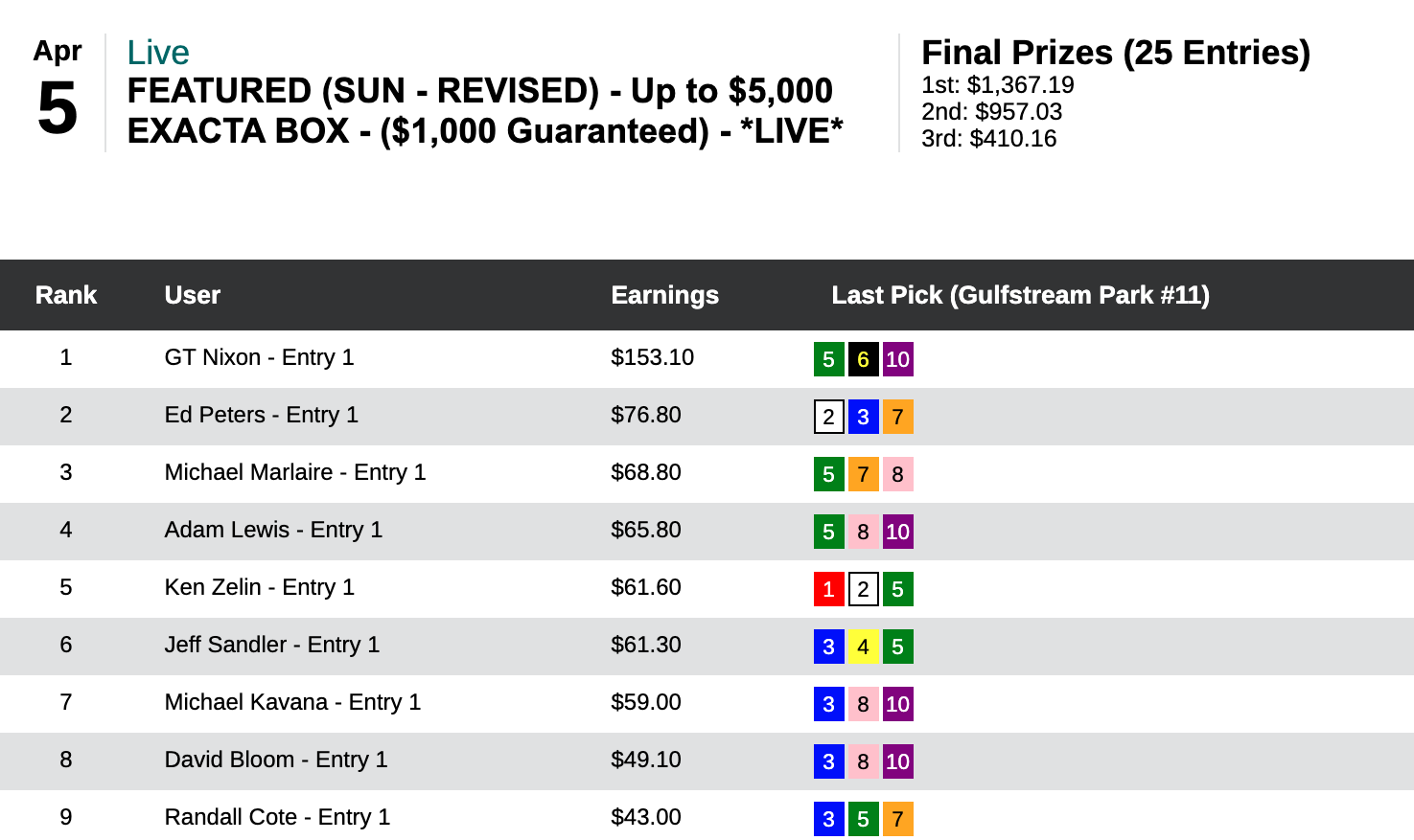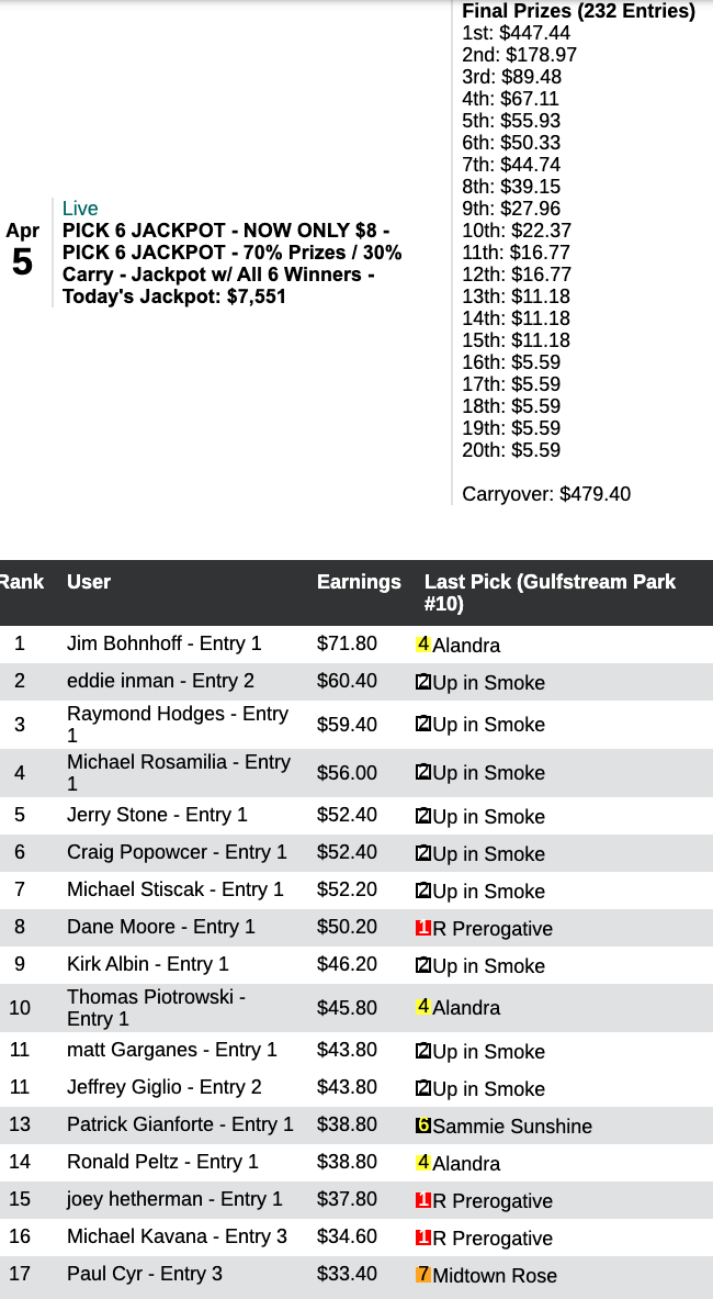 Sunday’s other “cash money” game was the $8 Pick 6 Jackpot tourney.
