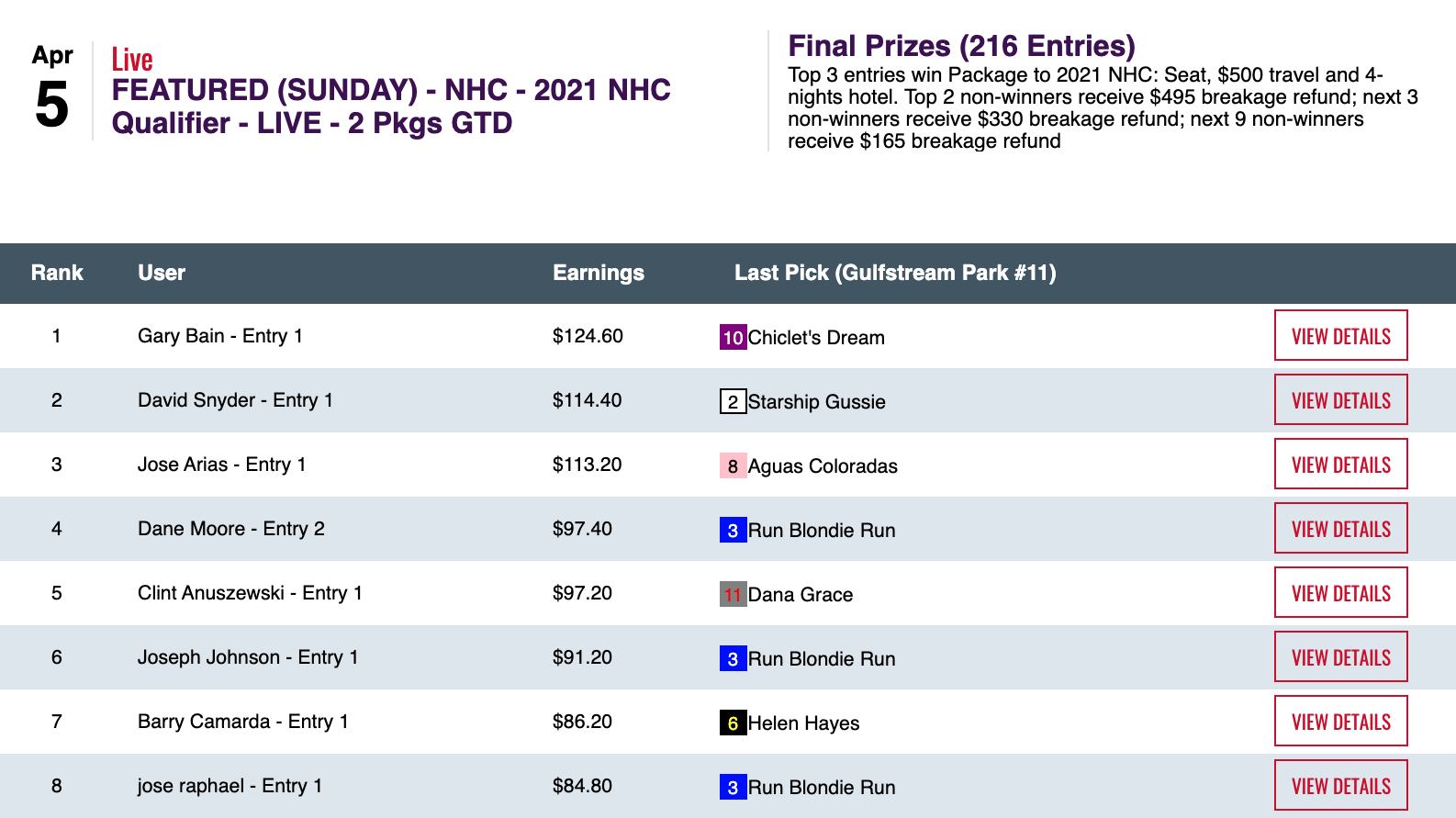 Cavalieri cracked the $200 mark by selecting 5 winners and 2 placers in Saturday’s NHC qualifier which—once again—had enough entries for us to award one spot more than the guaranteed amount. The two others to punch their tickets to Vegas were Eric Gielata (4 winners, 0 places) and Alex Hofbauer (3W, 2P).