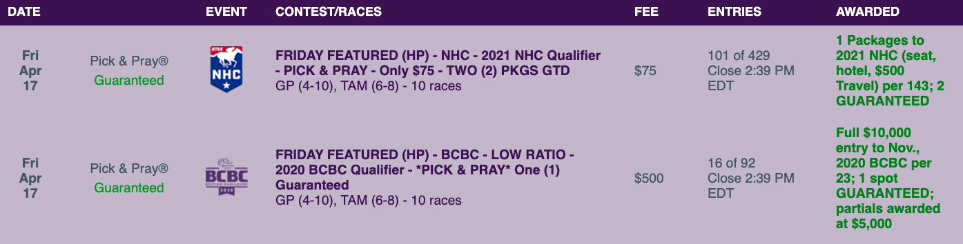 The $25,000 game will be run in live-format…as will most of the featured tourneys on Saturday and Sunday. Fridays, though, are always all Pick & Prays, of course, and we have four nice ones slated this Friday—two here and two at HorsePlayers.