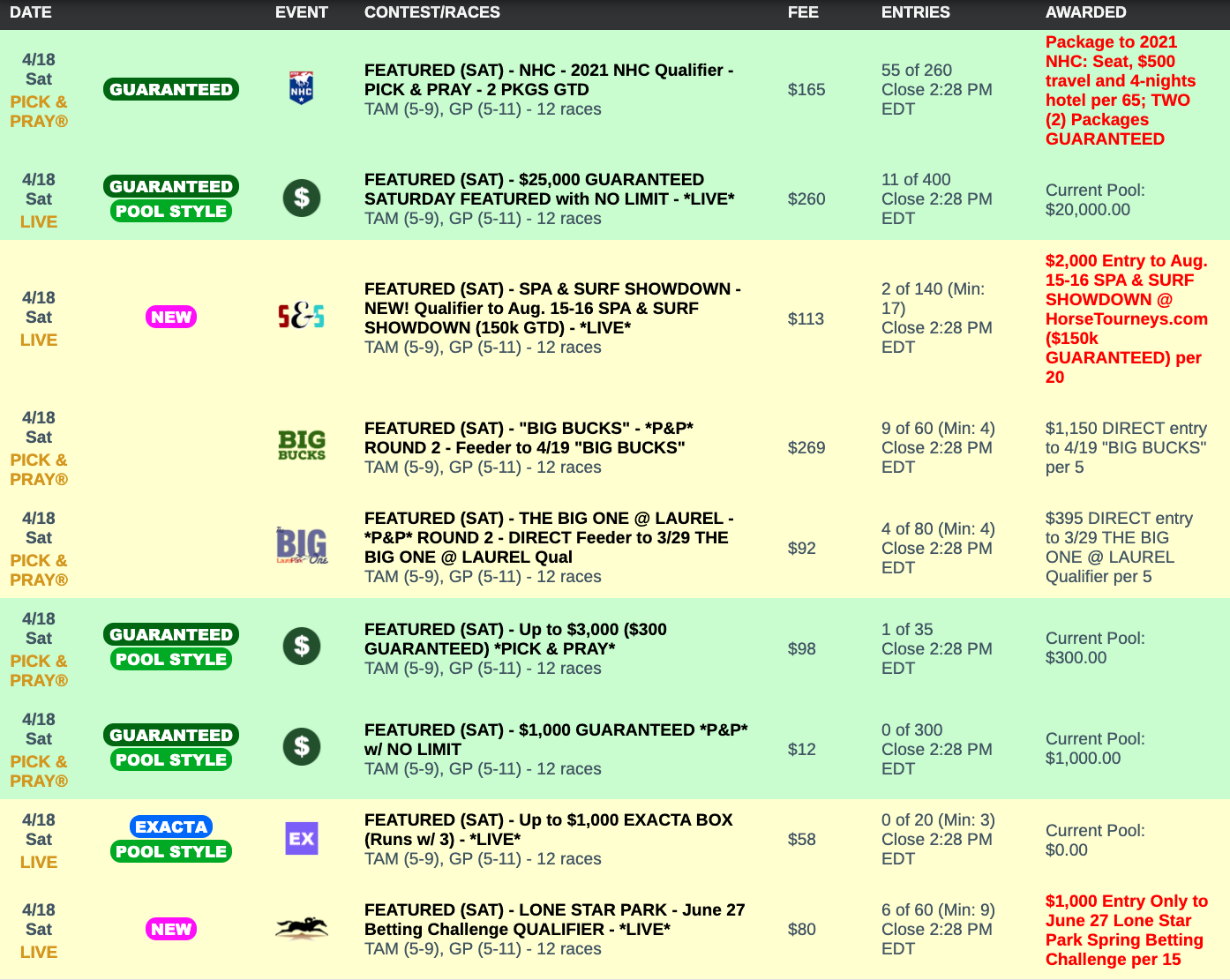On Saturday, we have a quartet of featured tourneys on tap at HorseTourneys.