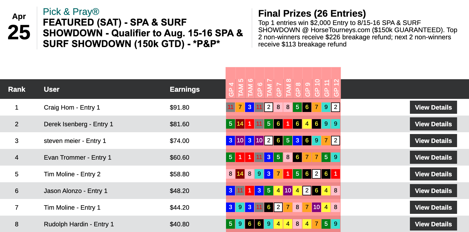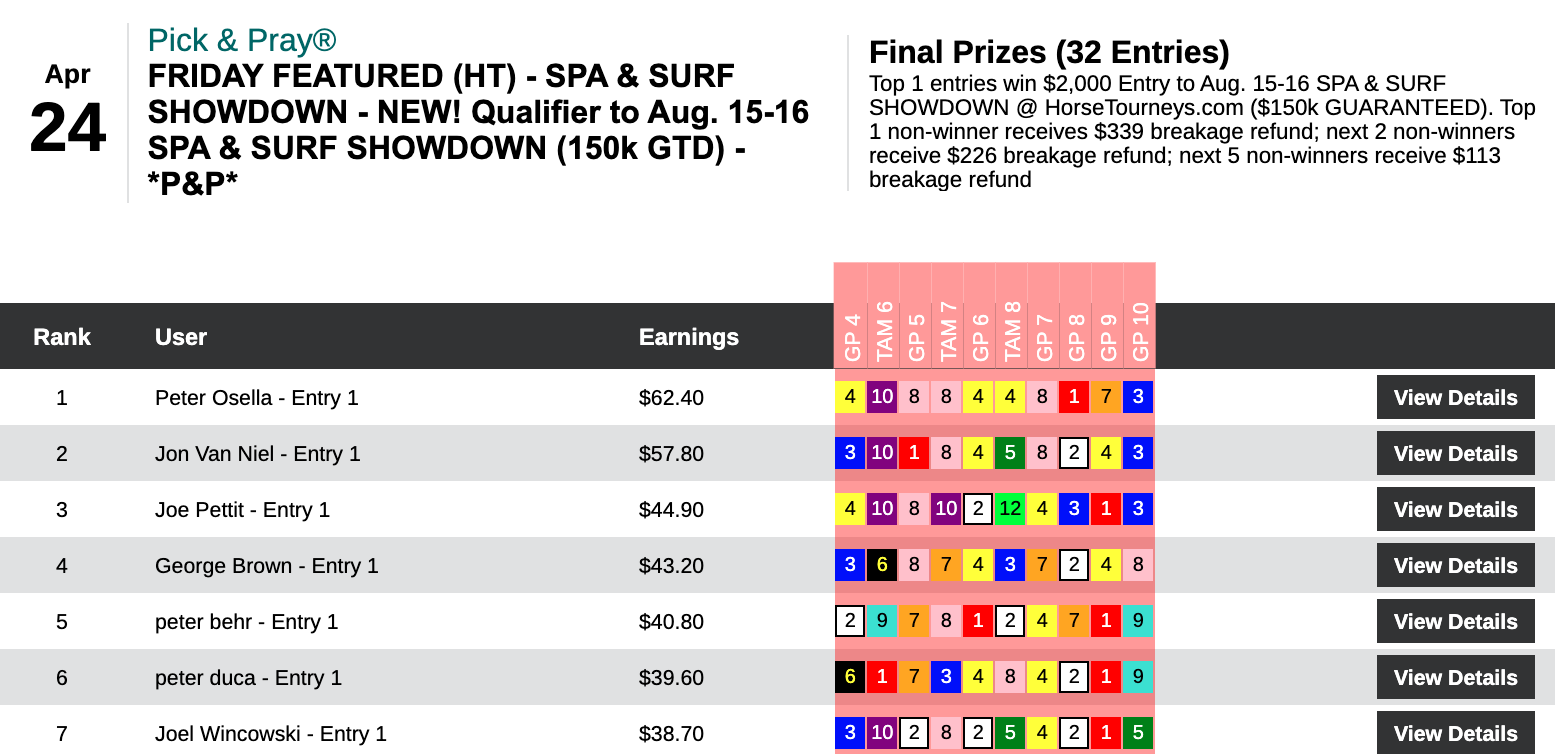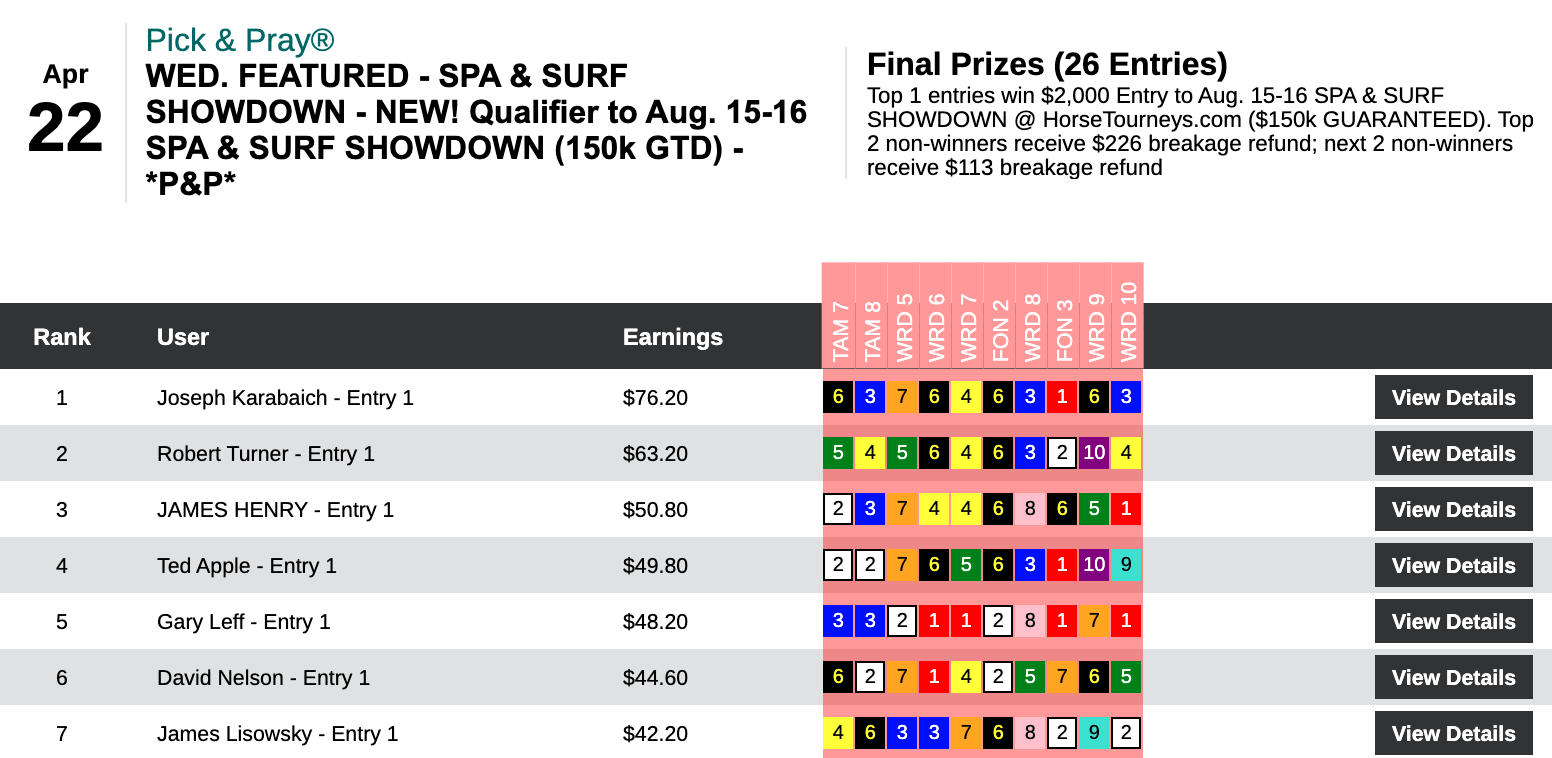 His 3 wins and 3 places got him all the way around in the day’s Spa & Surf Showdown qualifier. Over at HorsePlayers, meanwhile…