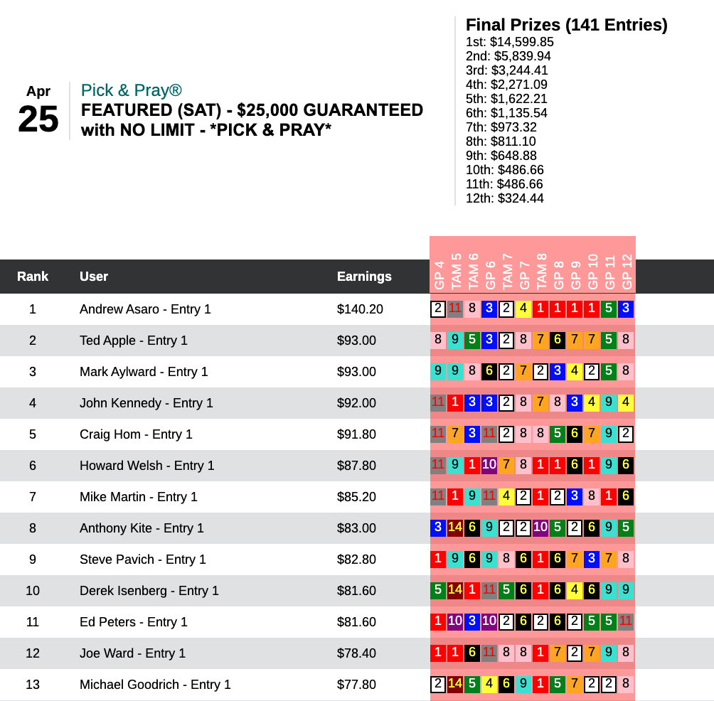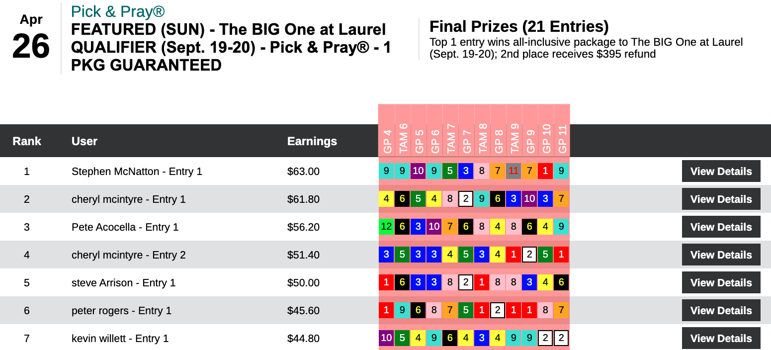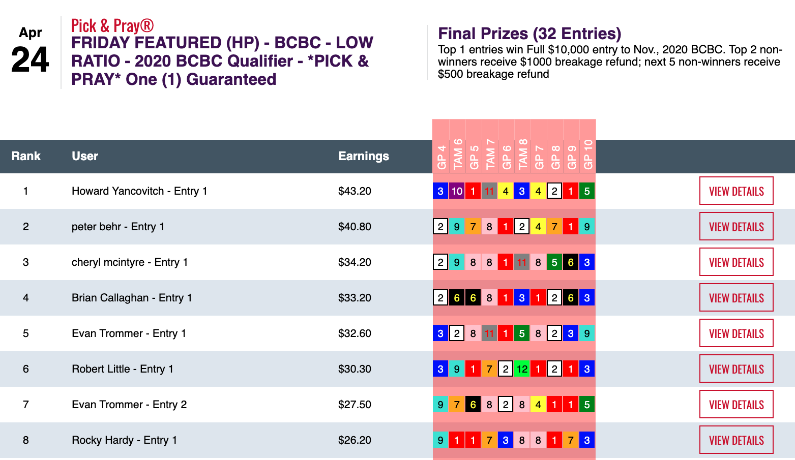 The day’s biggest overall purse (by about $500) came in our $12,500 Guaranteed Pick & Pray.