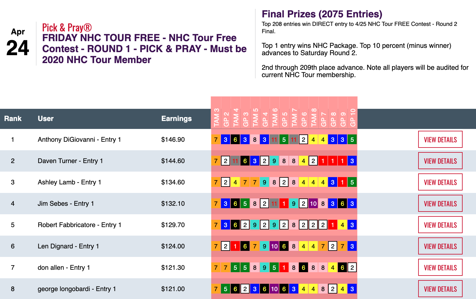 On Friday, HorsePlayers offered the first day of a 2-day, free NHC qualifier. As has been the norm with these, the top 10% moved on to play for five NHC seats on Day 2—but this time around, NTRA officials added a new wrinkle whereby the Day 1 leader was given a guaranteed NHC spot as well. I think it was a good move…because it would have been a shame had Anthony DiGiovanni’s work gone unrewarded.