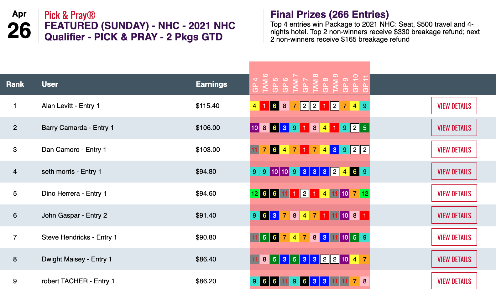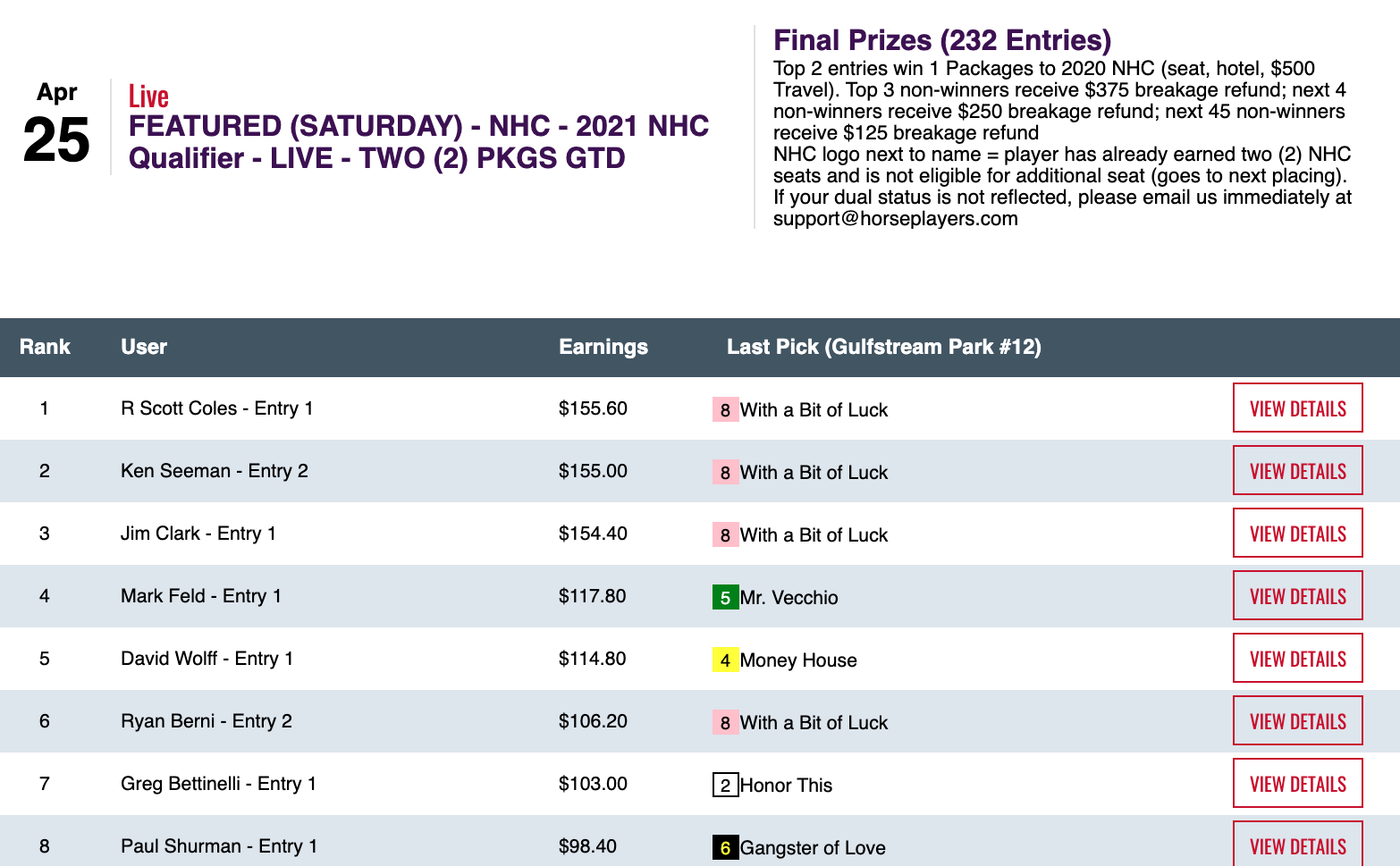 Congratulations to Joseph Clancey, John Vail, John Martin, Dan Slattery and Kent Crossley. It all added up to seven NHC seat winners on the day at HorsePlayers…which has to be some sort of unofficial single-day record.