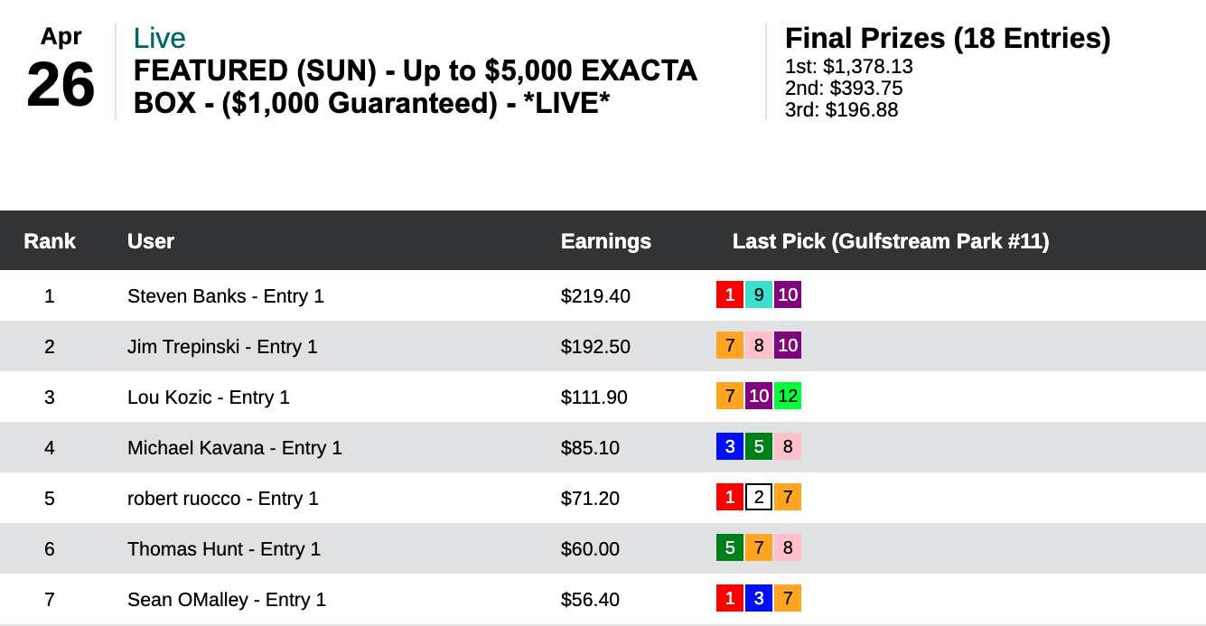 Steven Banks caught the $1 exacta worth $77.10 in the race. That was the last of his four successful three-horse boxes during the afternoon, which combined to earn him top money of $1,378 in a game ultimately worth a total of $1,968.