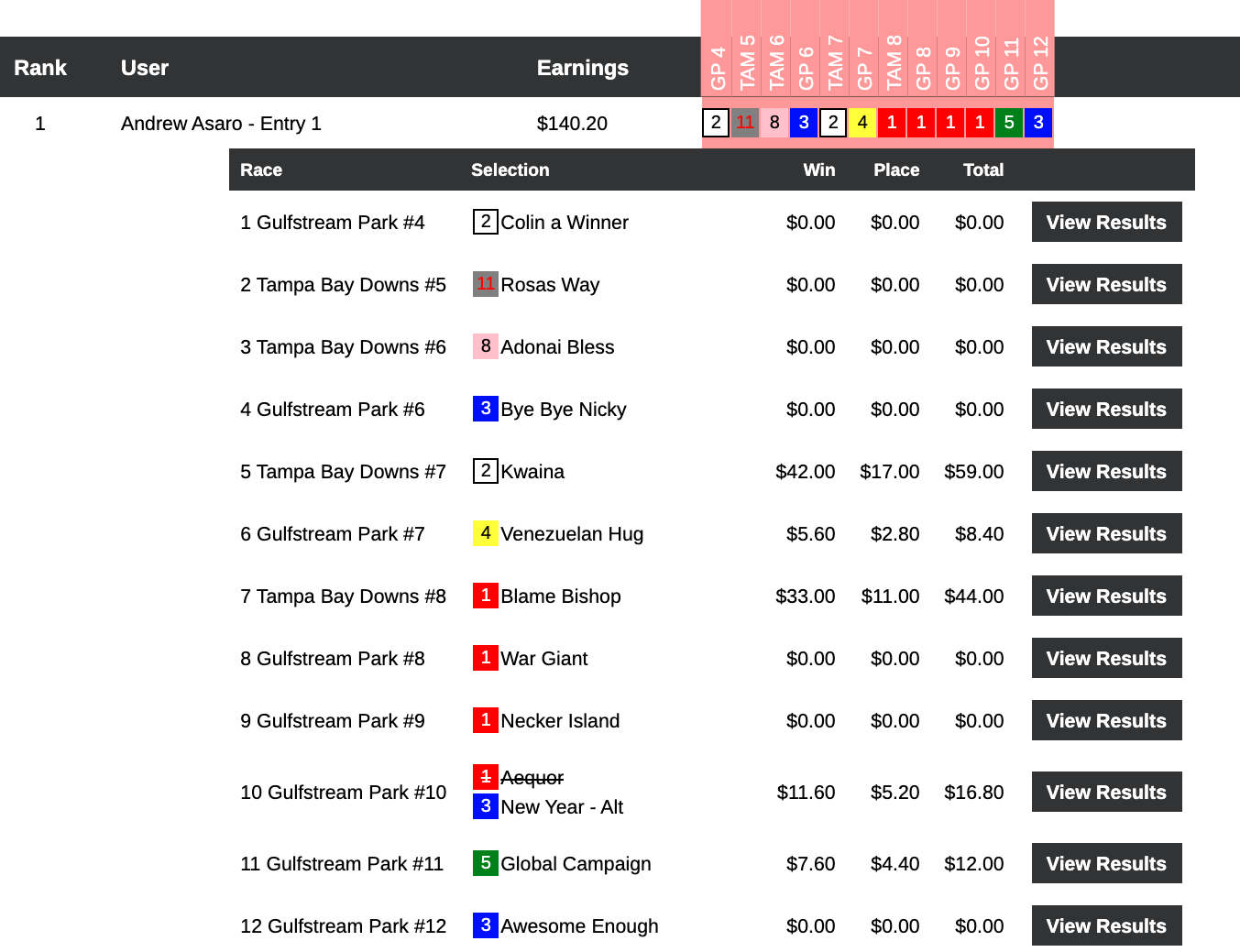 Asaro nailed 5 winners led by Kwaina ($53.80, $17.00) in the 7th at Tampa, and he drew off to win Saturday’s $25,000 Guaranteed Pick & Pray under wraps by $47.00. The payday for Asaro amounted to $14,599 from a total pot of $32,444. Here’s a look at his scoresheet:
