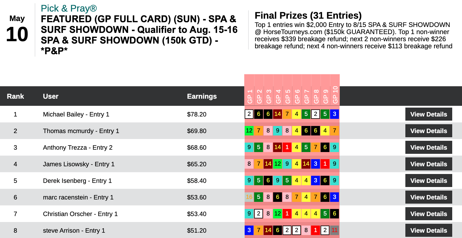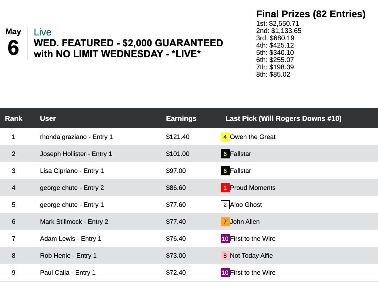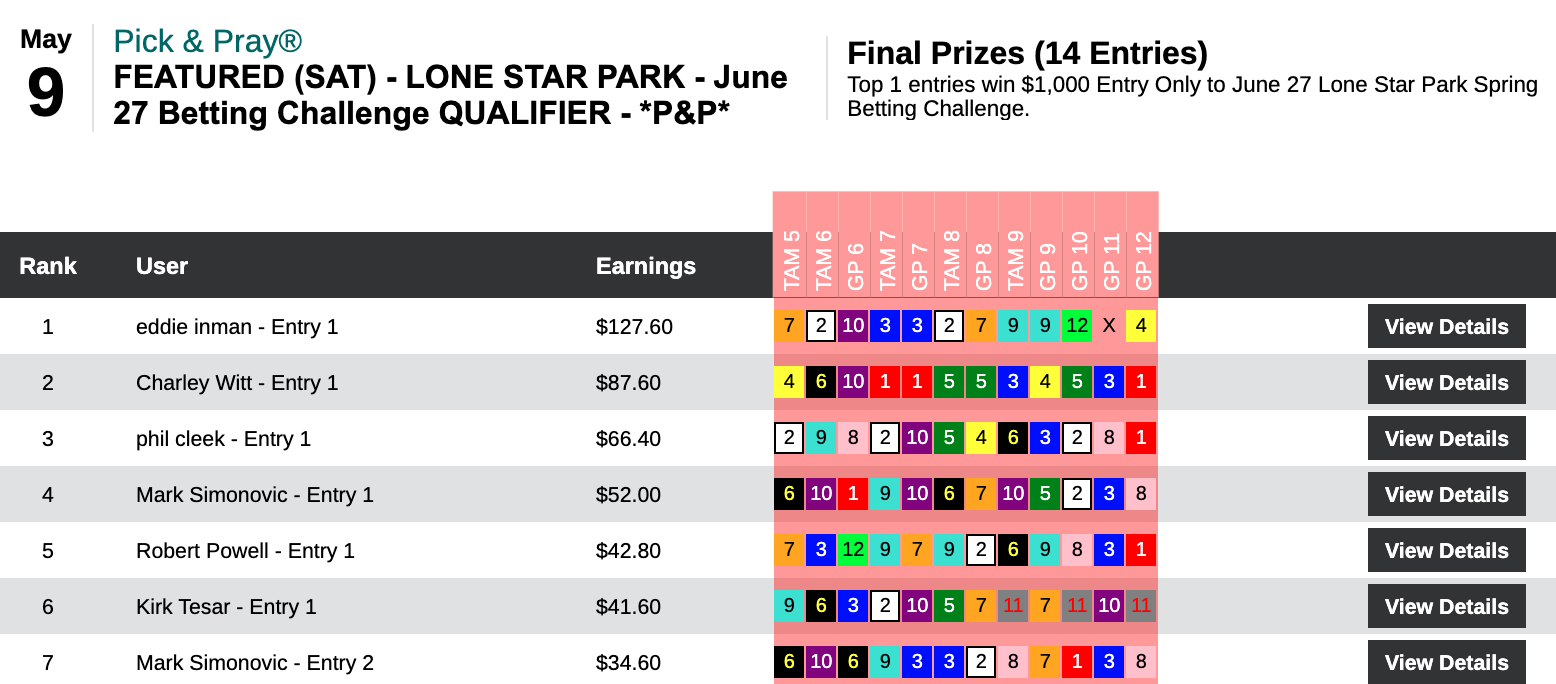 Charley Witt was the only contestant among 14 to have Do What it Takes, and so he led all the way until the last race—where Eddie Inman (who failed to get his pick in for the previous race) was the only one to choose Areyourtalkingtome. That sent victory—and the June 27th $1,000 entry—Inman’s way.
