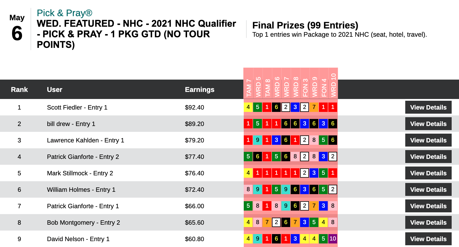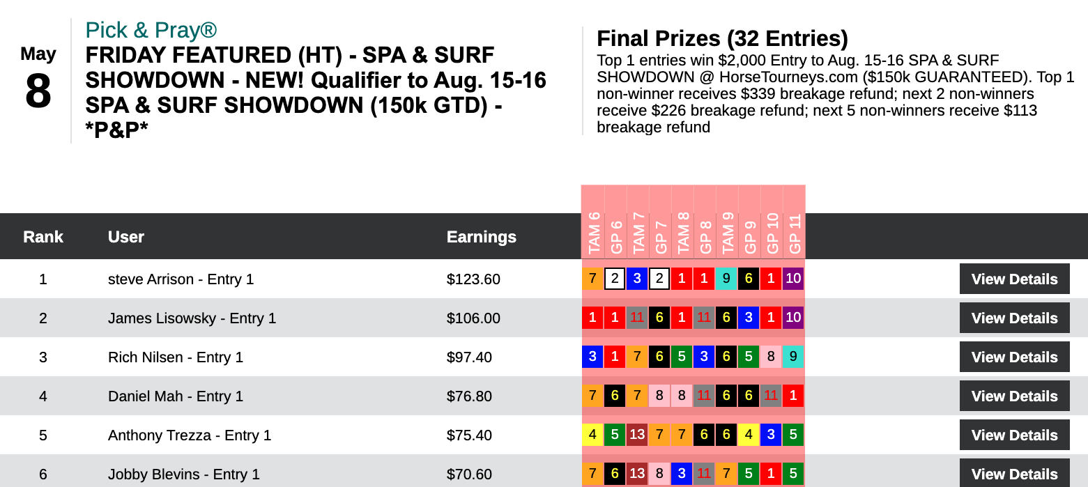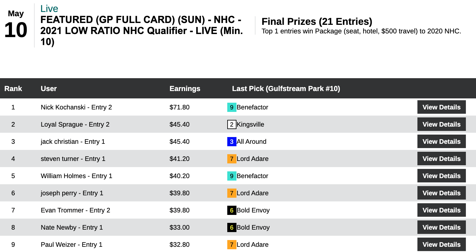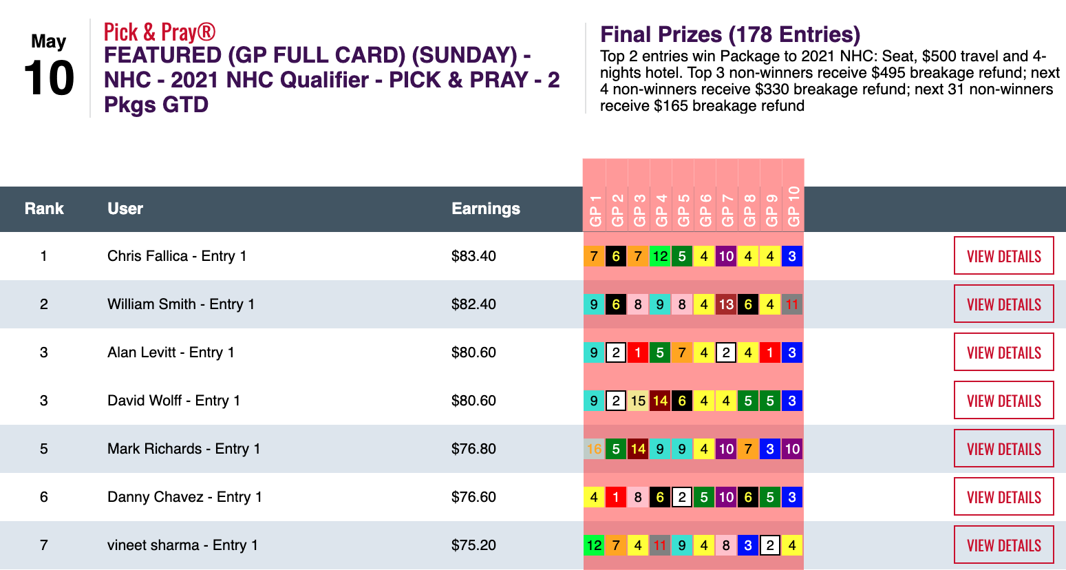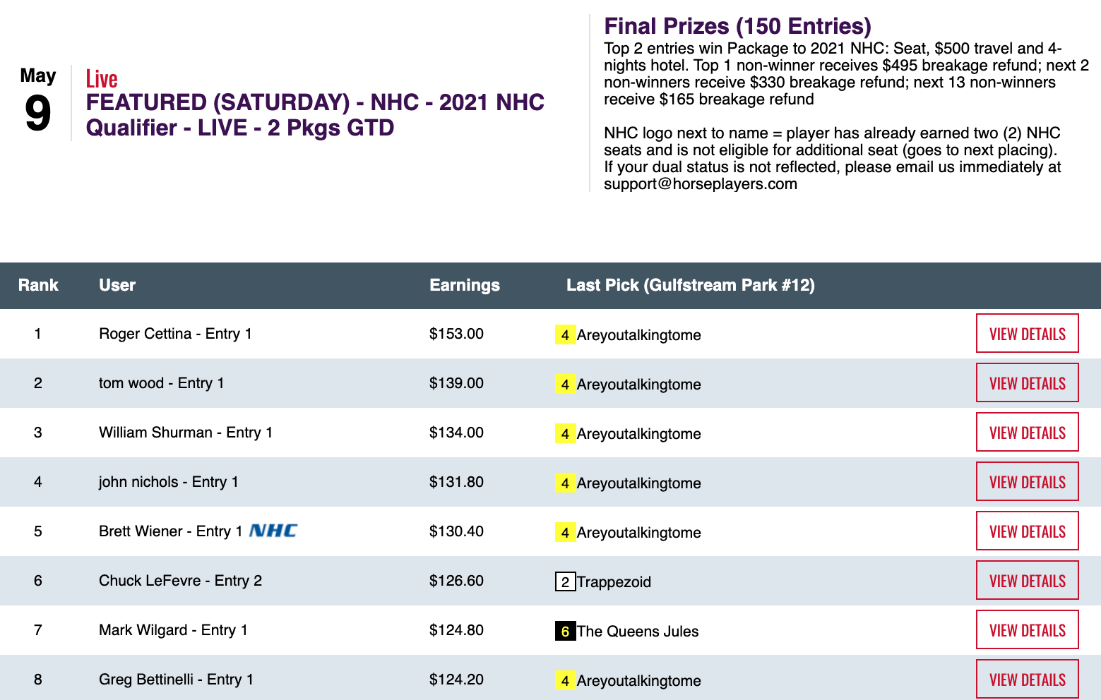 He was one of three NHC seat earners in Friday’s $75 2-seats-guaranteed qualifier, along with first-place (and now double-qualified) Sarah Wiener and third-placer Gary Wright. Wiener had 4 winners, all over the final six races. Arrison checked in with 5 firsts and one second. And Wright snagged the third and final available prize thanks to 3 wins and 2 places.