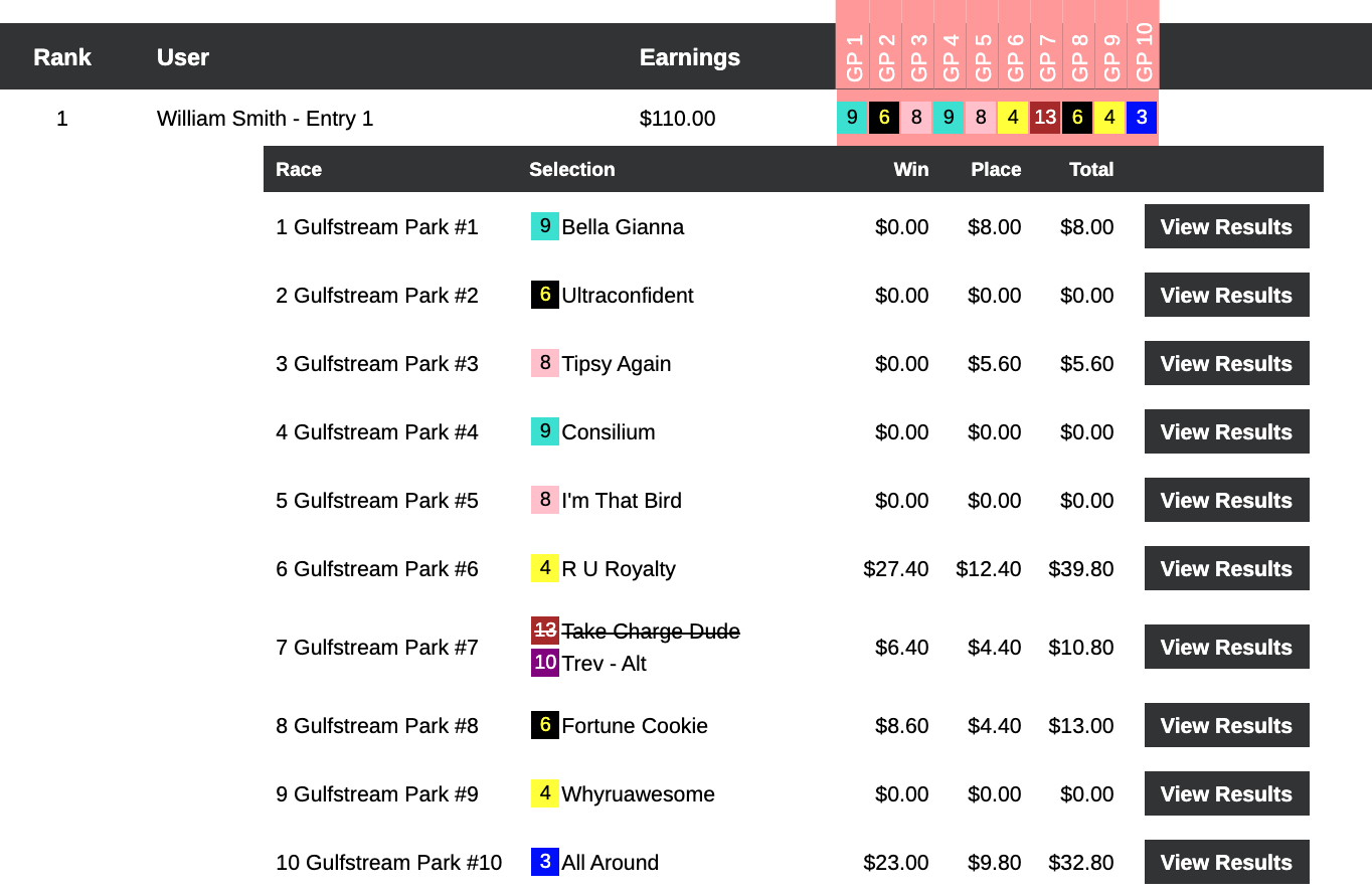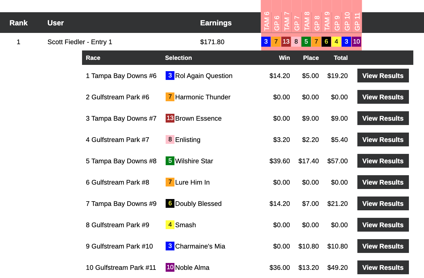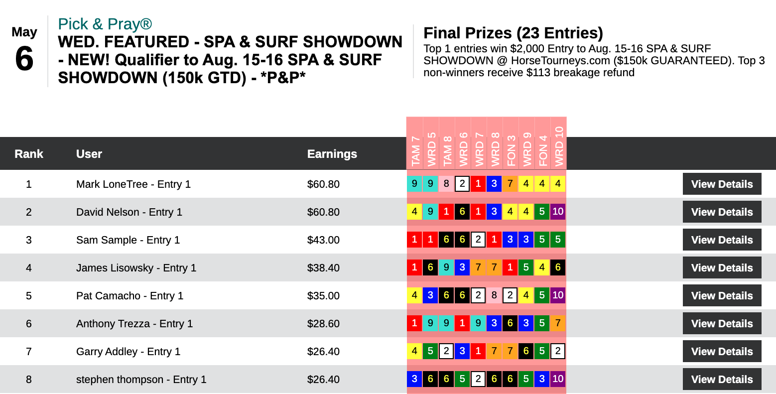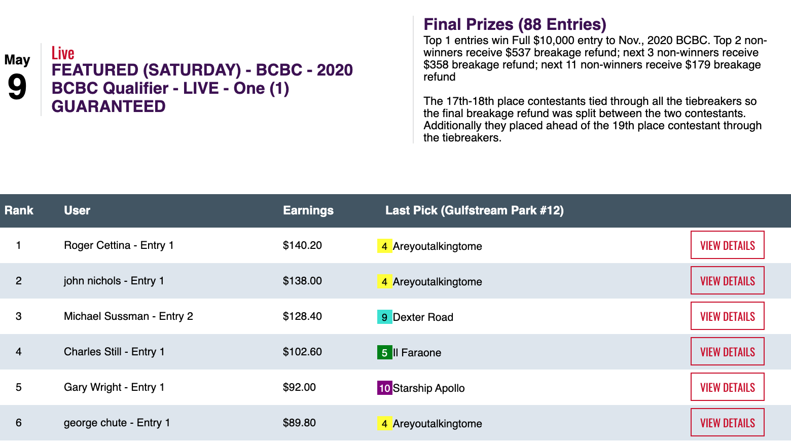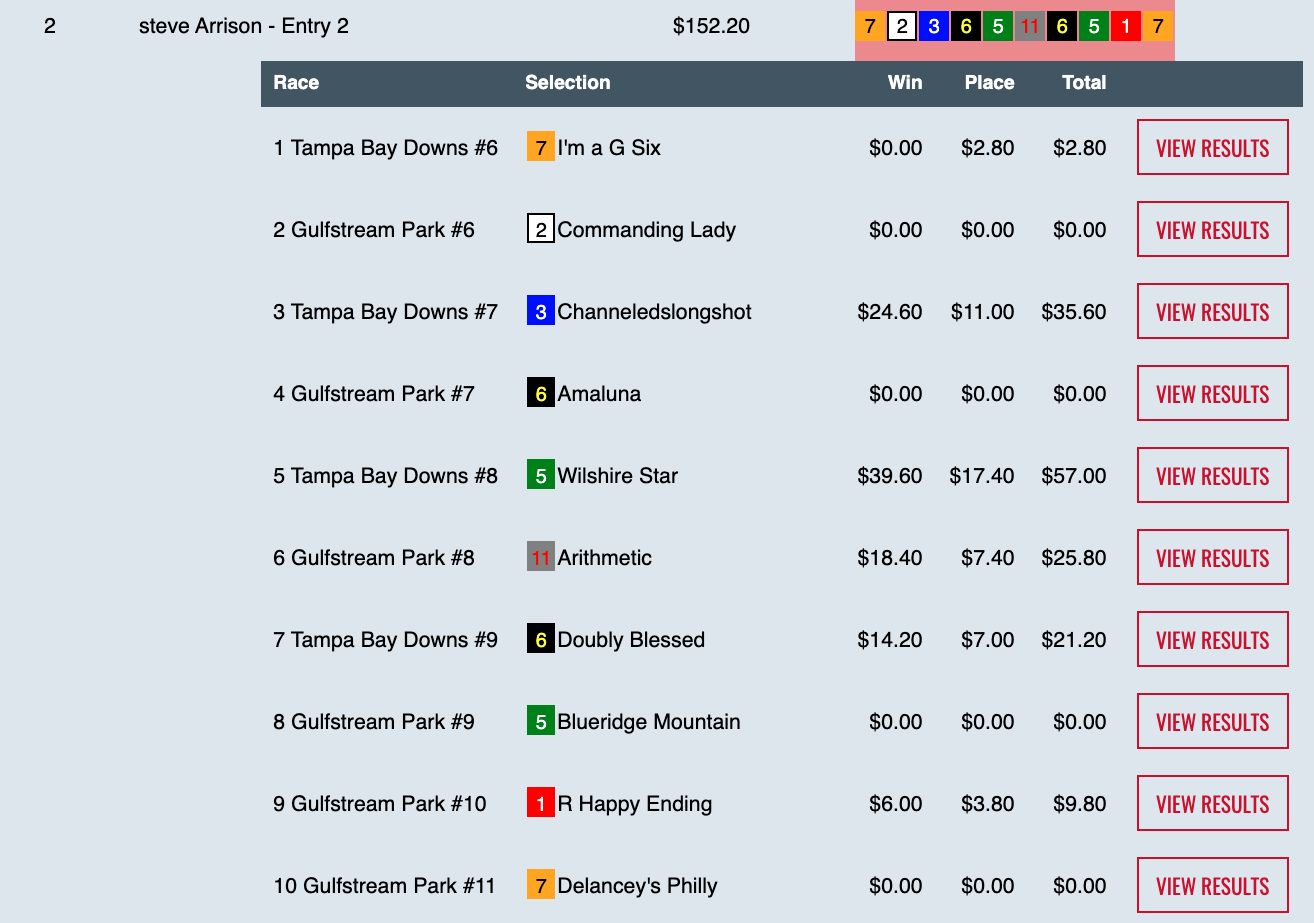 It actually was something of a tight squeeze for Sharma, however, as he prevailed by just $1.40 to pick up the grand prize of $10,483 in a game ultimately worth a total of $23,297. Sharma had 3 wins and 4 places, and it was one of those very harmless looking place payoffs ($2.40 in the 9th with favorite Frosted Grace) that wound up providing the margin of victory.