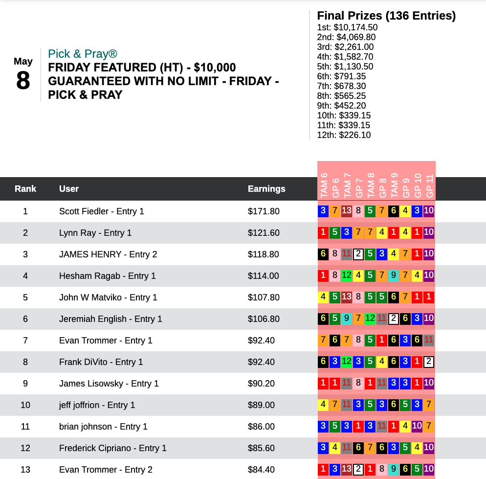 Fiedler’s total of $171.80 — built on 5 wins and 2 places, including a 17-1 hit in the final race — resulted in a payday of $10,174 in Friday’s $10,000 Guaranteed Pick & Pray, which ended up with a final purse of $22,610. Here’s how Fiedler conducted his second day of winning: