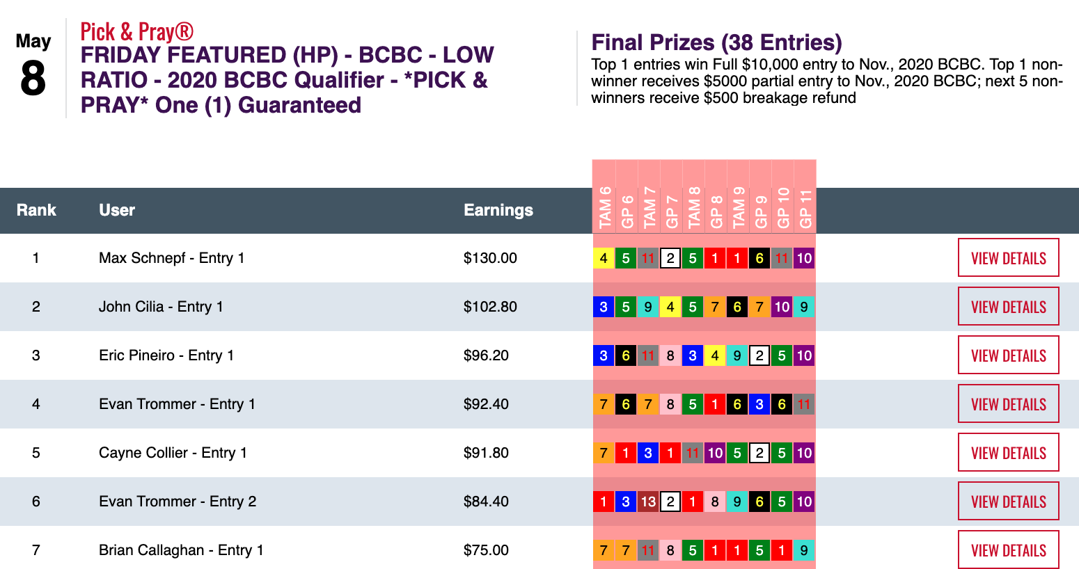Just five days earlier, on Sunday May 3, Arrison used the same picks in two Pick & Prays and won seats to the NHC and The BIG One. He used a different strategy this past Friday, though.