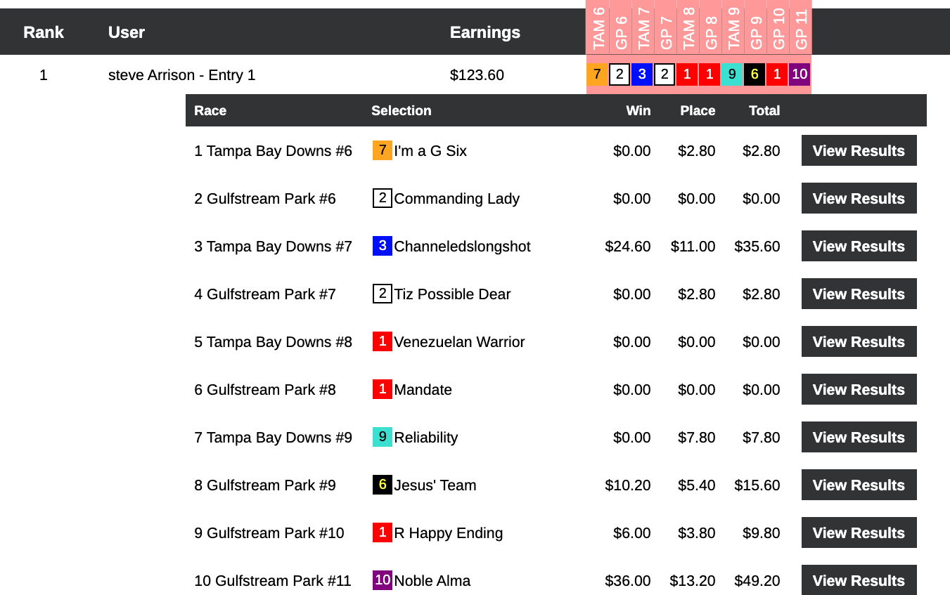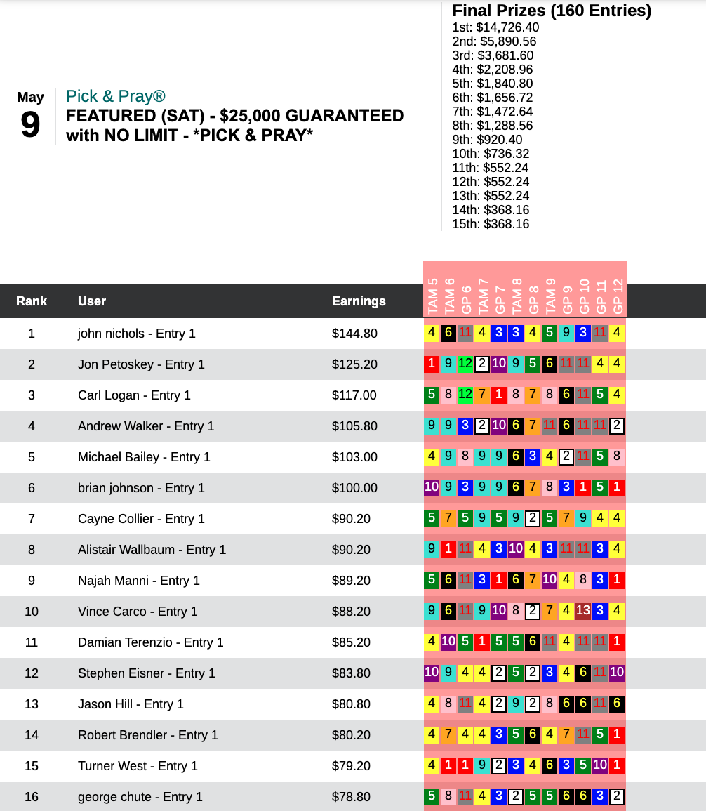 The two biggest prices during the day came in the first race of our tourneys and the last—and in each contest, Nichols (3 wins, 4 places) had them both, starting things off with Do What It Takes ($37.20, $15.40) in the 5th at Tampa and closing things out with Areyoutalkingtome. In Saturday’s $25,000 Guaranteed cash game, Nichols wound up with a winner’s share of $14,726 from a prize pool of $36,816.