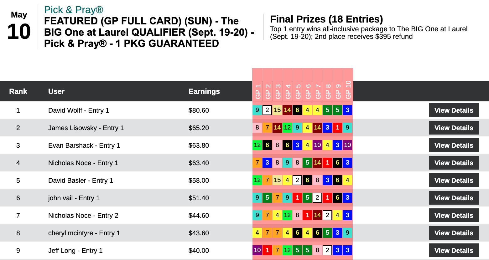 Glenn Bechtel had three entries in the field of 295. Two of them were among the three to survive the first two races—and one of those two was the only perfect entry after three races. Unfortunately, Bechtel’s dreams of a perfect game (and a five-figure Jackpot) ended soon thereafter. But rather than spit the bit, Bechtel came back with one of his “lesser” entries and captured first place after All Around took the nightcap at 10-1.