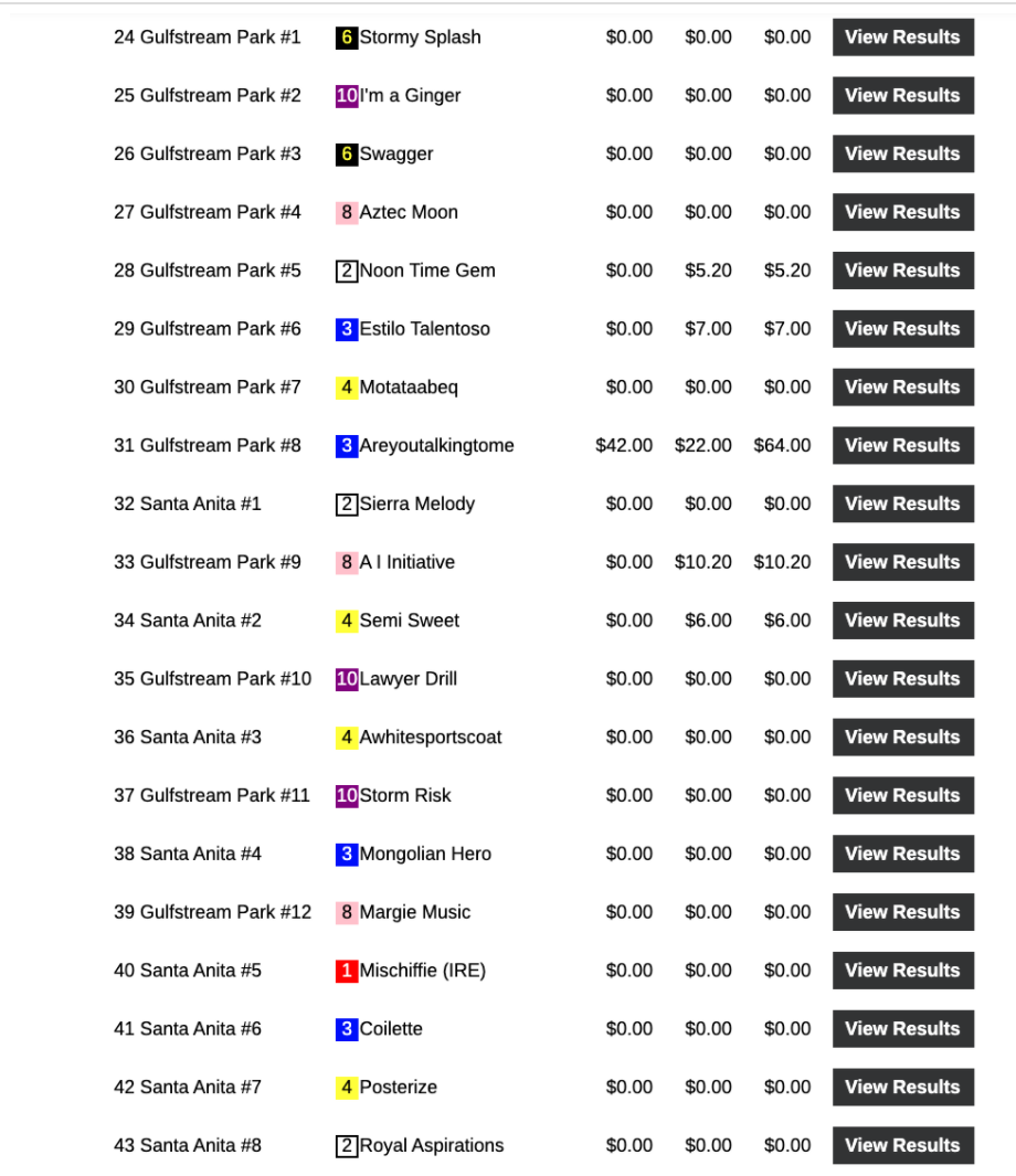 No fewer than five of the fighters in Sunday’s $1,000 Guaranteed Exacta tourney had the $189.60 (for $1) exotic in the 6th at Gulfstream. So Graziano had more work to do in the 10th and final round to make it to the top of the judges’ scorecards, and she did just that thanks to a $60.20 punch in Gulfstream’s finale that earned her another winner’s purse of $1,454. Final pot here was $2,078.