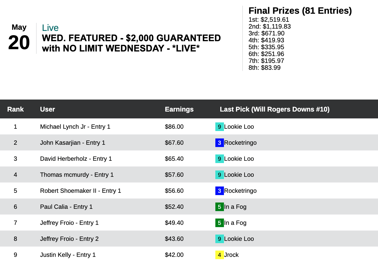 Kottoncandy Kisses ($27.40, $11.00 in the 7th at Will Rogers) was the major collection for Lynch among 3 wins and a place. Those plays landed Lynch top money of $2,519 in Wednesday’s $2,000 Guaranteed cash game, which closed wit a purse of $5,599.