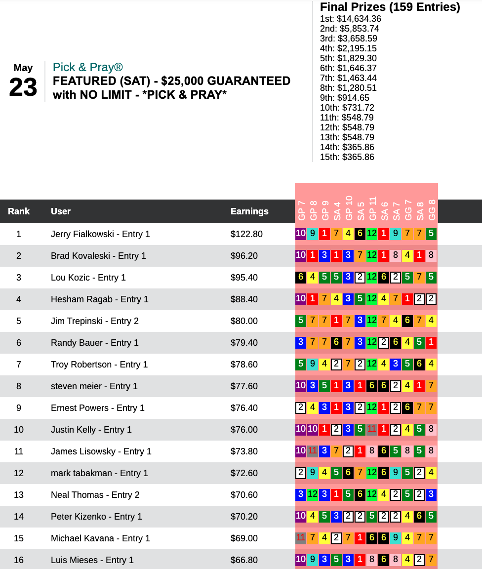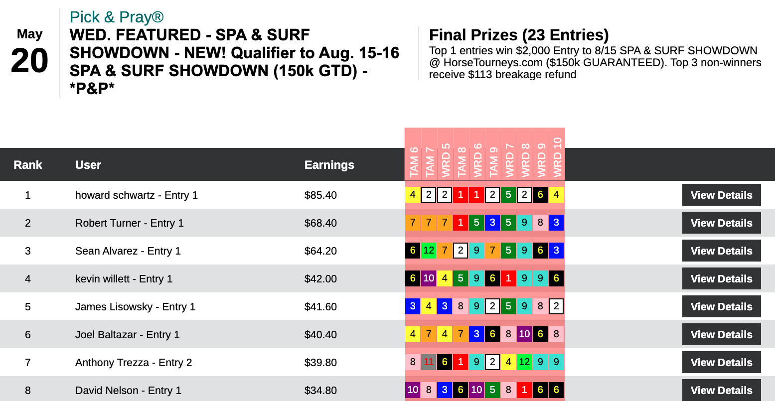 Schwartz had five winners—at prices of $3.00, $15.40, $3.40, $27.40 and $10.40—to earn a $2,000 entry to the August 15-16 online contest offering a guaranteed pot of $150,000. Numbers crunchers will note that the three winning scores on Wednesday fell within a very narrow range—$85.20 to $86.00.