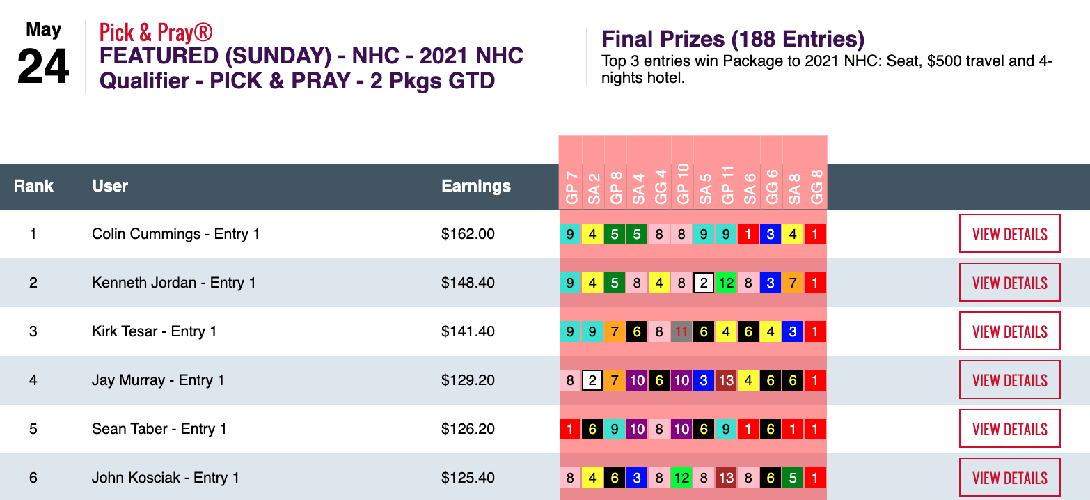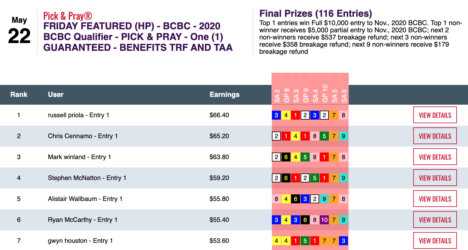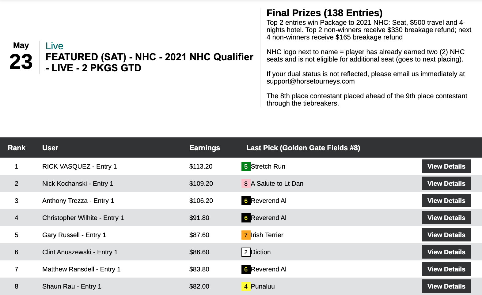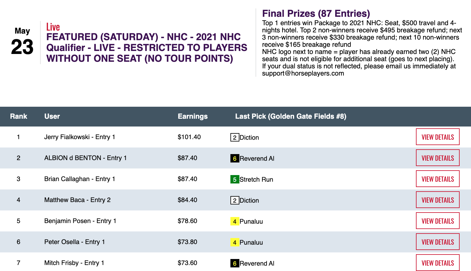 Over at HorsePlayers, there were again enough entries in Friday’s $75 NHC qualifier to award three seats in the 2-seats-guaranteed event.