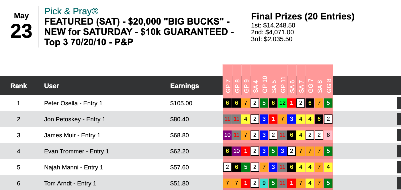 Congratulations to Peter Osella (4 wins, 3 places) who was our inaugural Saturday Big Bucks hero. He was the only player in the sold-out field of 20 to use Key Biscayne among his Pick & Pray selections. The end-result: a payday for Osella of $14,248 from a total final purse of $20,355.