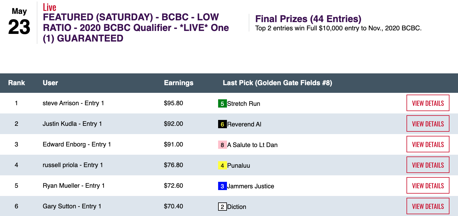 Friday’s BCBC qualifier at HorsePlayers had a tight and exciting finish.