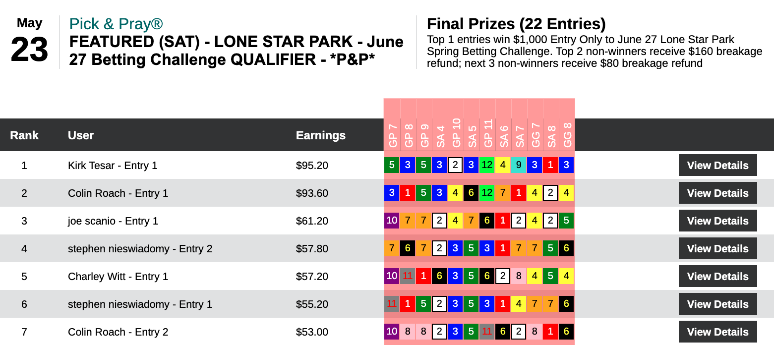 Tesar finished with one winner and two places. Despite whiffing on the final five races, Tesar held on by $1.60 and earned his second seat to the Lone Star Park Spring Betting Challenge on June 27.