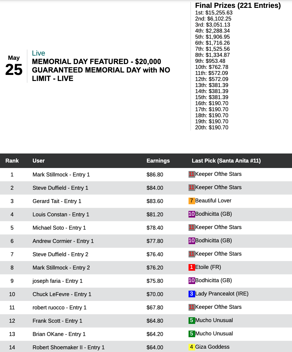 Going into the final race here, Stillmock had entries sitting in 2nd and 6th places. Ultimately, it was his 6th-place ticket that rose to the top, though, thanks to Keeper Ofthe Stars ($16.60, $7.40) in the Gamely at Santa Anita. It turned out to be good timing for Stillmock to be on his game. This $20,000 Guaranteed, Live-format tourney wound up being the richest of the weekend with a final pot of $38,139. Stillmock’s share of that was $16,590 ($15,255 for winning and another $1,335 for coming in 8th).