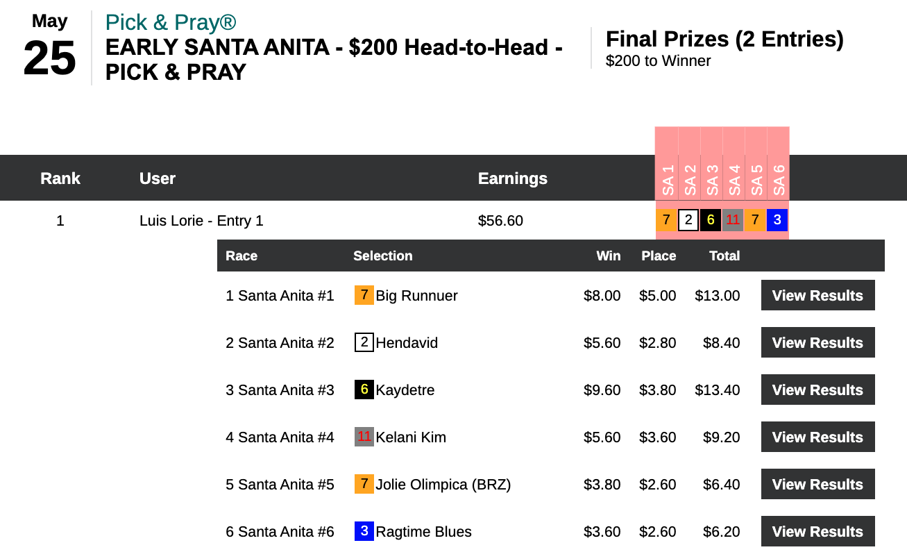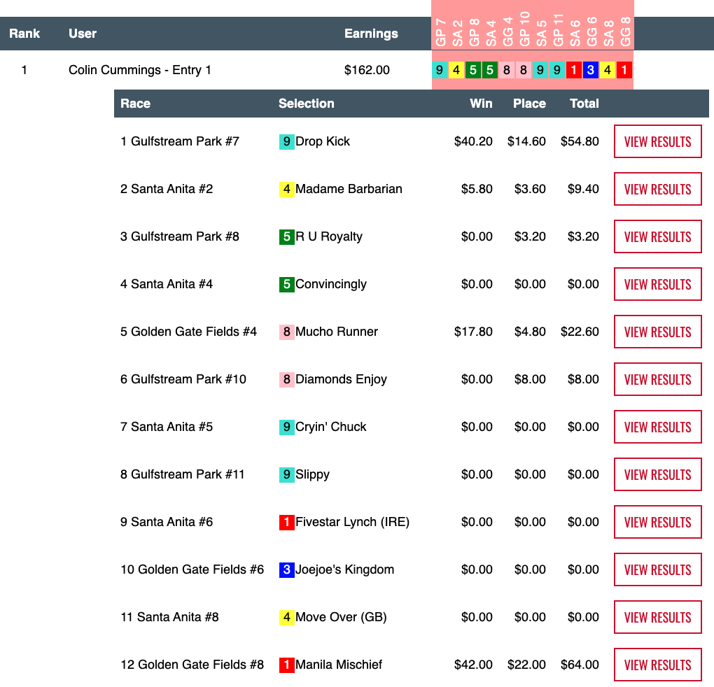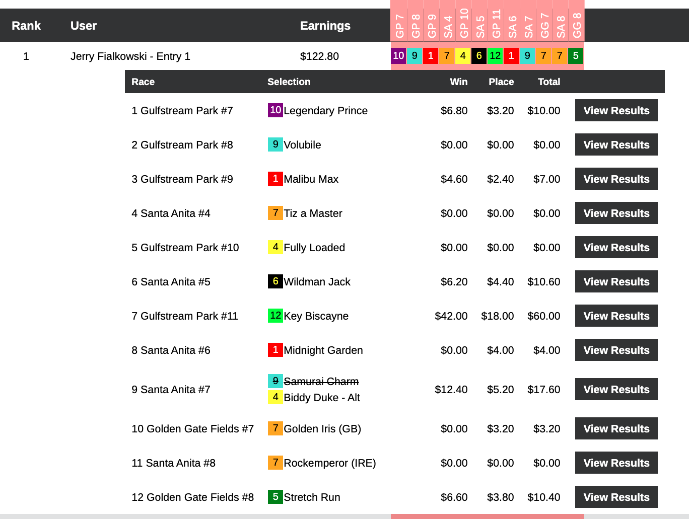 So reason for my note is that I have been observing how these LIVE events unfold. Good handicapping is happening throughout the day, but then in the final few races, guys who are way behind are always seeking the bomb to leapfrog to the front. I’ve seen it happen many times and was the victim of it as you observed on the Big Bucks on Sunday. It somehow struck me that it is not rewarding the best handicapper as these are desperate plays that these players would not normally play. It is why the Pick and Pray is a better reflection of true handicapping, however, the one downside is you don’t get to handicap to current conditions in a Pick and Pray and are left with the picks you had should track conditions change to sloppy as an example or half the field, including your top choices, get scratched.