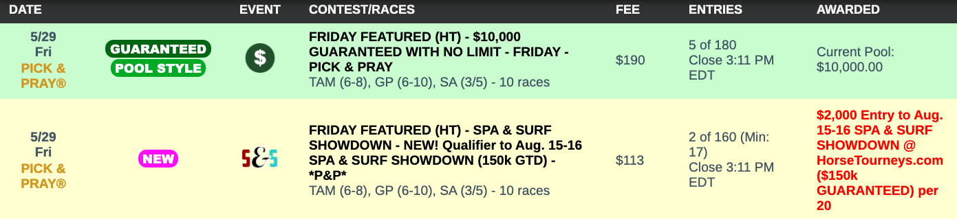 Friday also represents the first of three consecutive Spa & Surf Showdown qualifiers on offer this weekend. Each day, a grand prize of a $2,000 entry will go to one of every 20 entries. The buy-in on Friday (and the other days) is $113. The winners get to play two full days of racing from Saratoga and Del Mar on August 15 and 16 for a cash-only prize pool that is guaranteed to be at least $150,000.