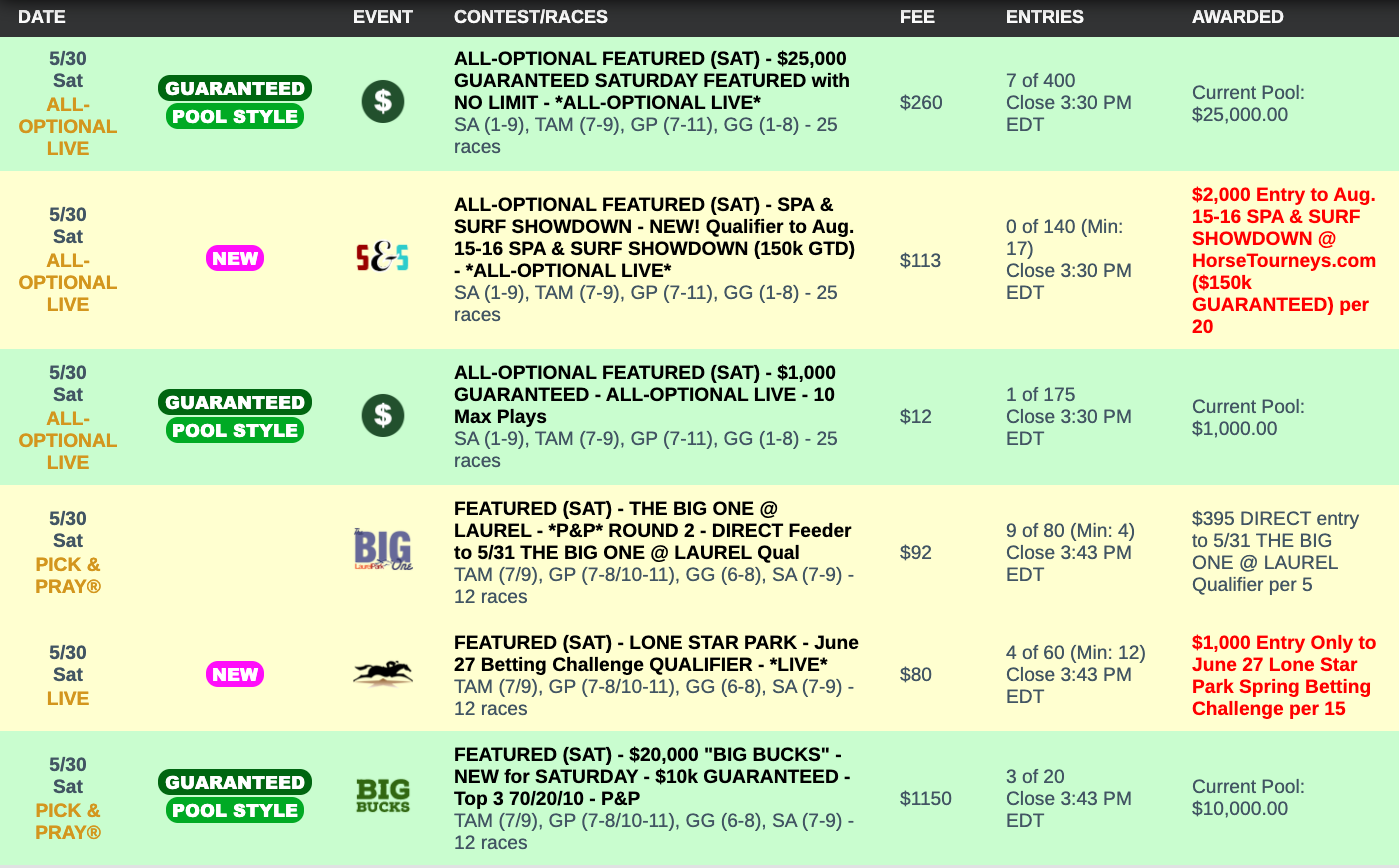 The 25 Saturday contest races for the two All Optional Live games at HorseTourneys are the 1st through 9th (full card) from Santa Anita; the 7th through 9th at Tampa; the 7th through 11th from Gulfstream; and the 1st through 8th at Golden Gate. The deadline for entry will be about 3:30 pm ET.