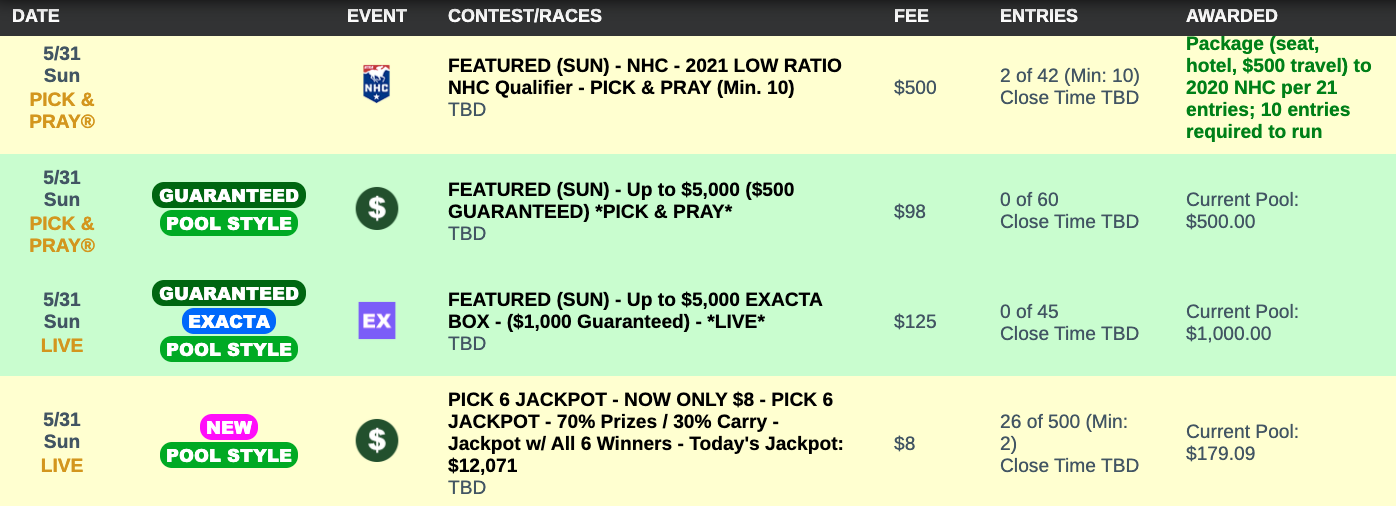 There are also a couple of more customary, 12-race featured tourneys on Sunday. One is the day’s Low Ratio NHC qualifier. It’s not a guaranteed event—there have to be 10 $500 entries on the books for this game to “go”— but this game has yet to not fill. The winning ratio is 1-per-21. (Note that, per NHC Tour rules, Tour points will only be available here if there are enough entries to award two seats.)