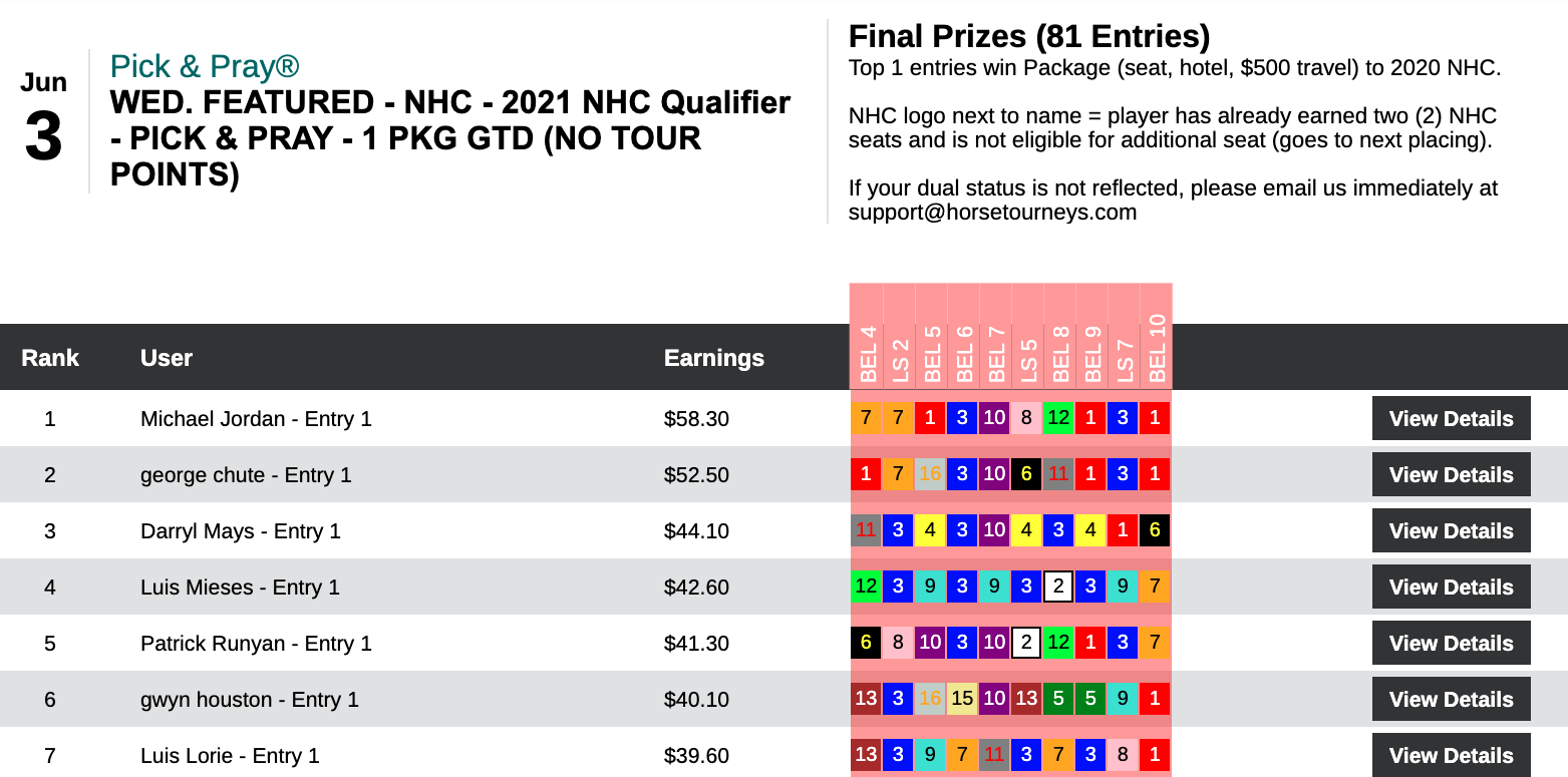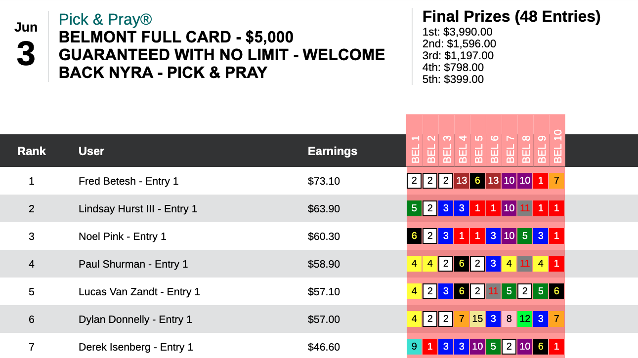 That performance led to Betesh winning our special “Welcome Back NYRA”, $5,000 Guaranteed Pick & Pray, which was contested solely on the 10-race Belmont card. Betesh’s share of the pie worked out to $3,990, from a total prize pool of $7,980.