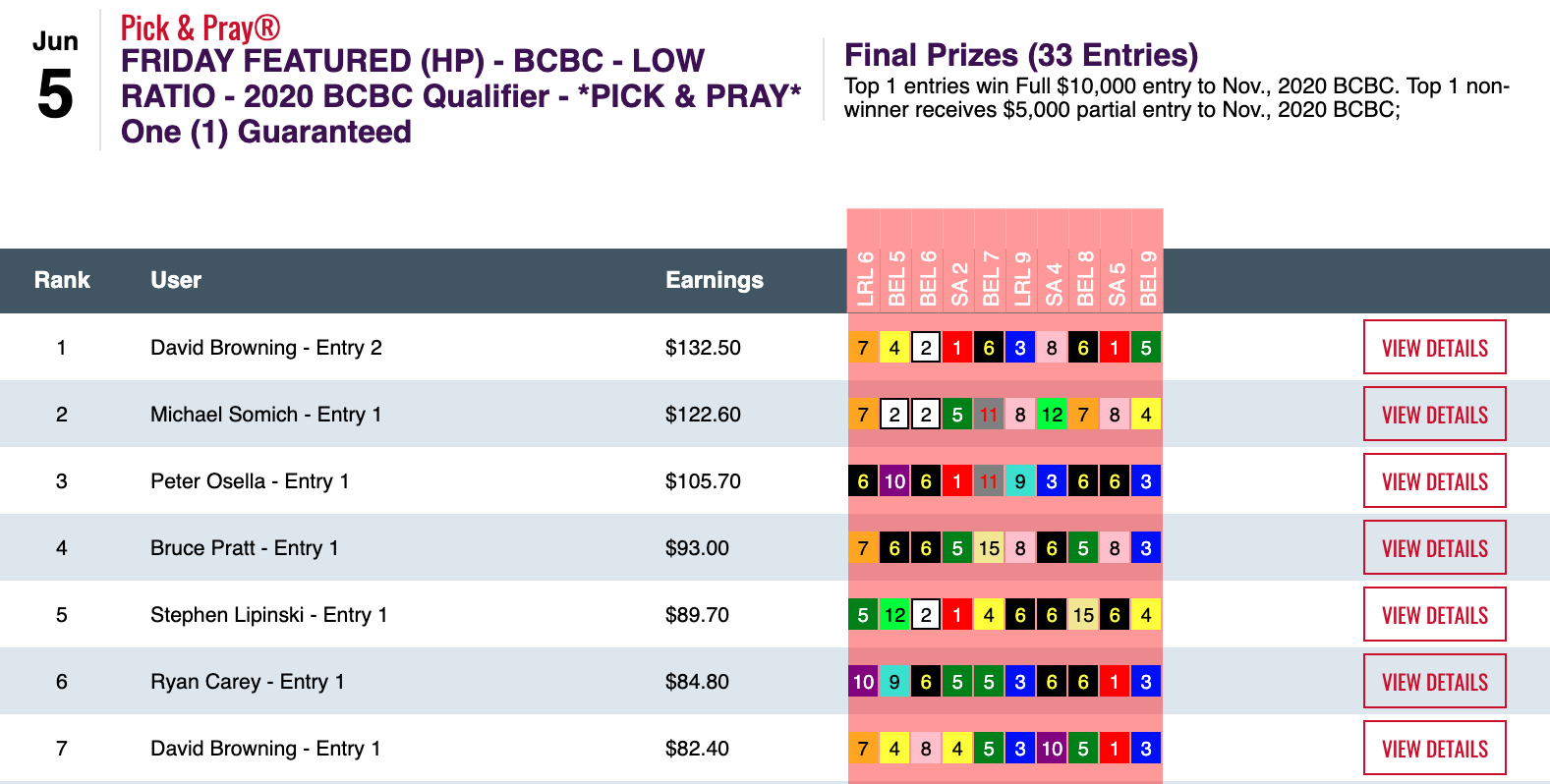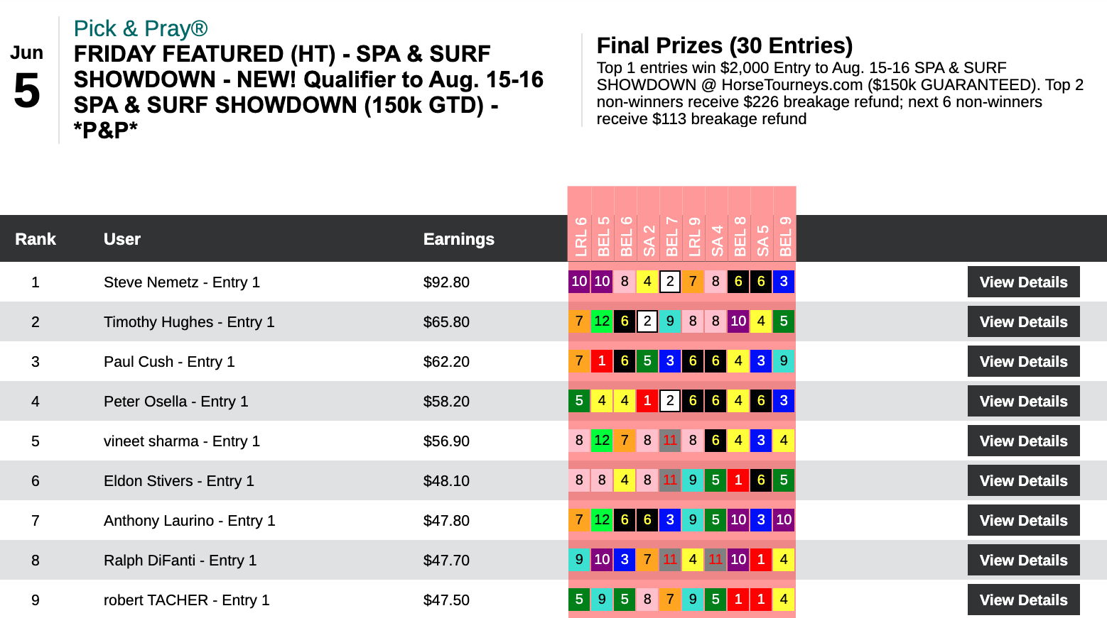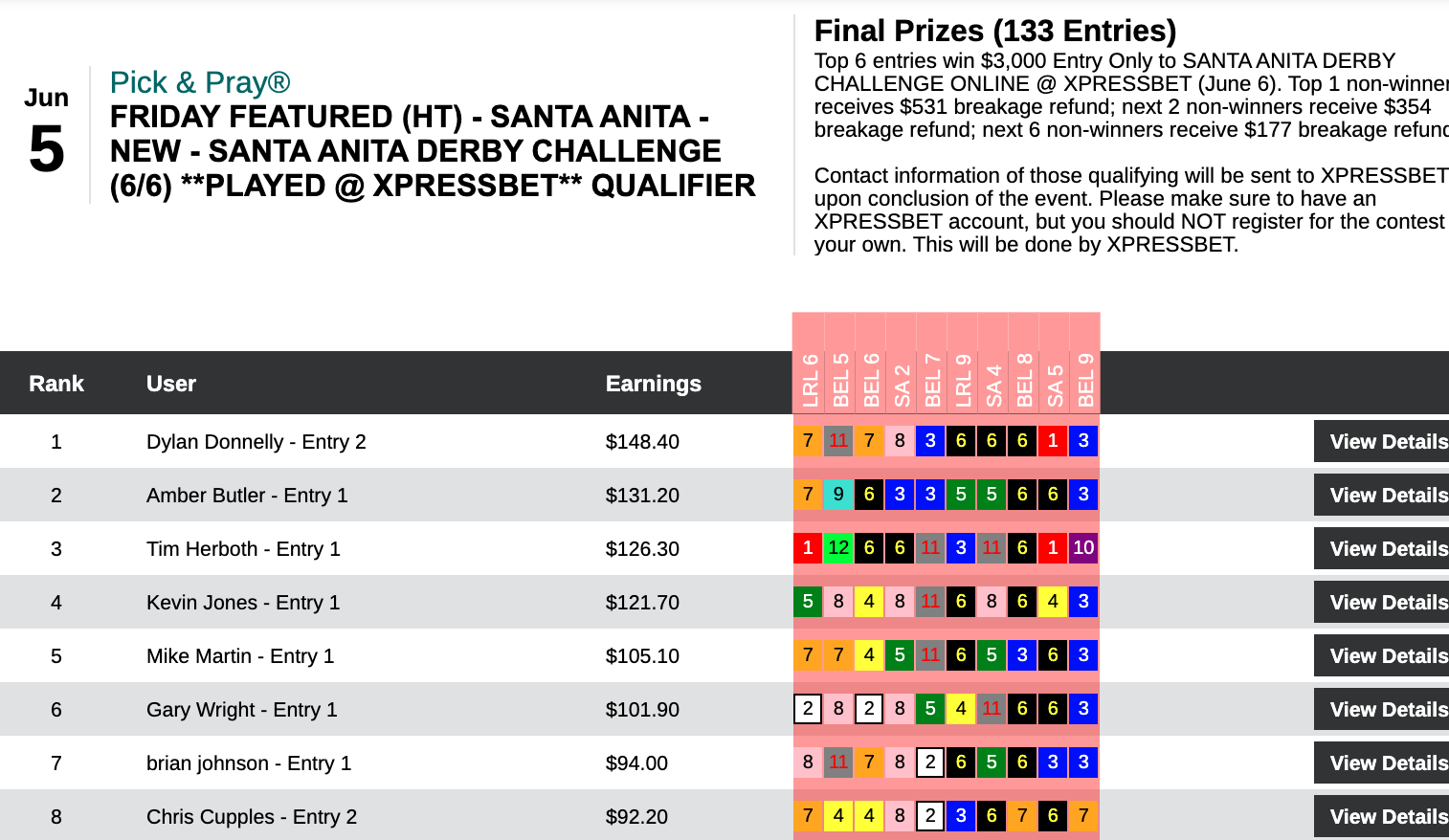They were among his 3 wins and 1 place that earned him a $7,780 payday in Friday’s $10,000 Guaranteed Pick & Pray, which had a final purse of $17,280.