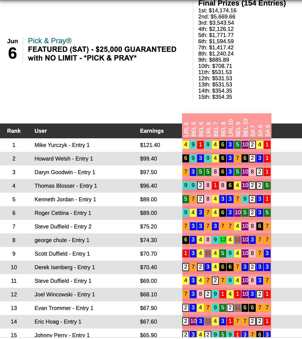 The three Yurczyk winners amounted to a victory worth $14,174 in Saturday’s $25,000 Pick & Pray, which closed with a pot of $35,435.
