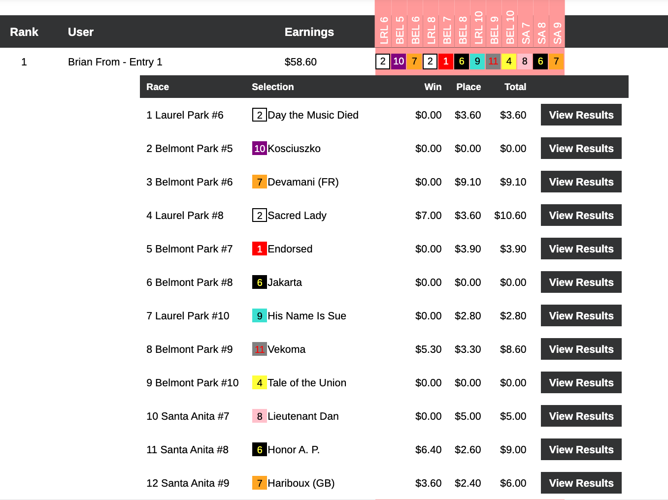 In our other two Saturday features, no one selected Grinning Tiger, which left the door open to anyone who could string a few winners (or even placers) together.