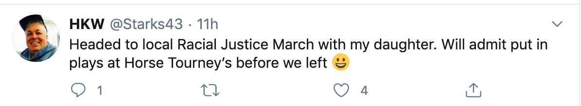 Regular readers of this blog know that we do not use this space to engage in any sort of societal or political discourse. Let it be known, however, that we vigorously defend Americans’ right to protest peacefully—as long as they get their HorseTourneys picks in before they head out.